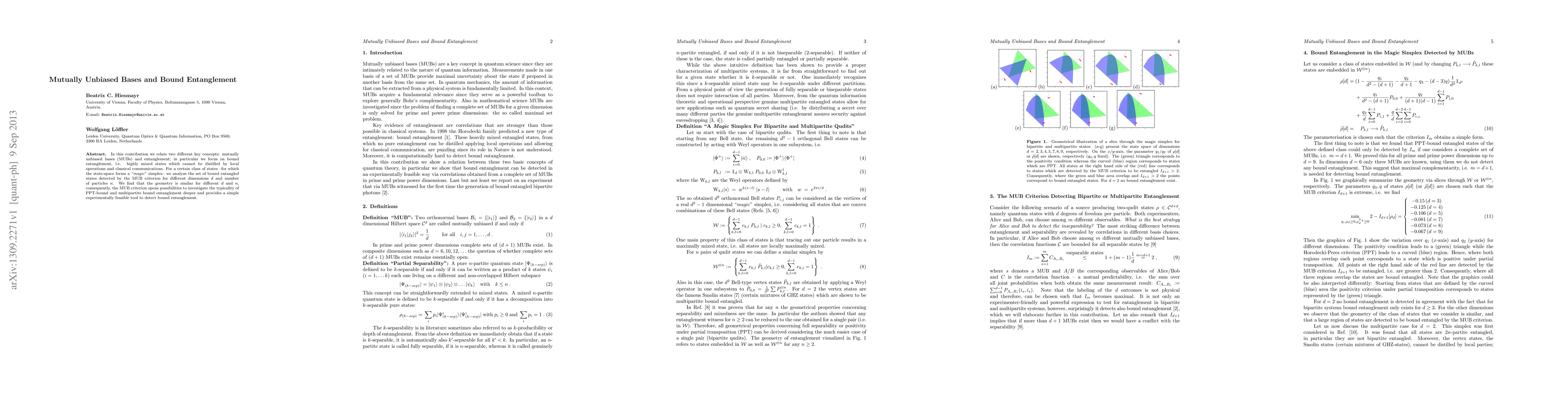 In this contribution we relate two different key concepts: mutually unbiased bases (MUBs) and entanglement; in particular we focus on bound entanglement, i.e. highly mixed states which cannot be distilled by local operations and classical communications. For a certain class of states --for which the state-space forms a "magic" simplex-- we analyze the set of bound entangled states detected by the MUB criterion for different dimensions d and number of particles n. We find that the geometry is similar for different d and n, consequently, the MUB criterion opens possibilities to investigate the typicality of PPT-bound and multipartite bound entanglement deeper and provides a simple experimentally feasible tool to detect bound entanglement.