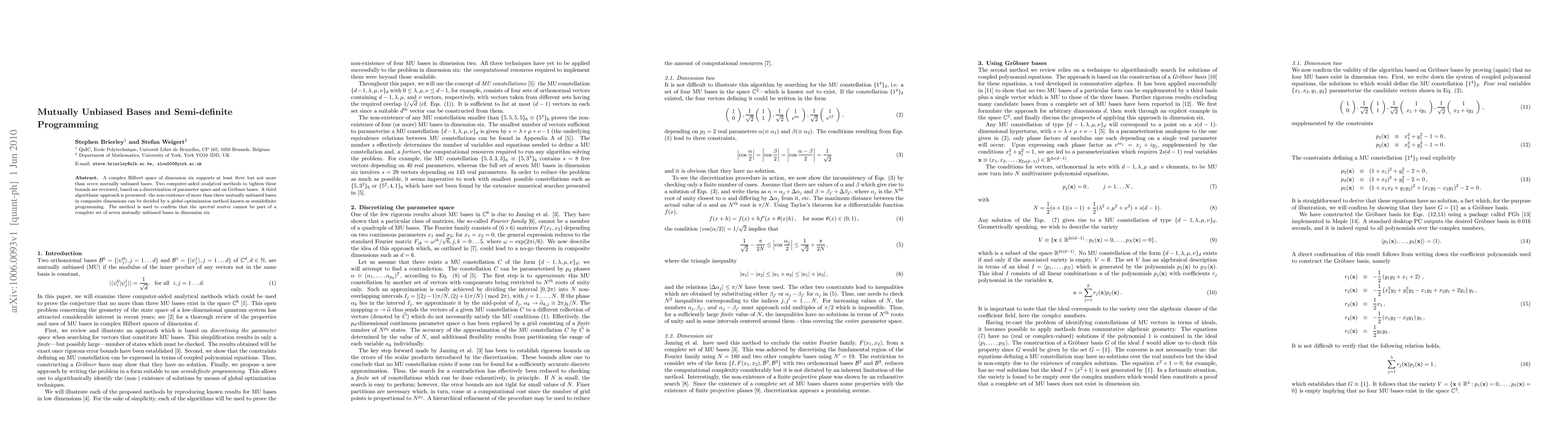 This paper explores the existence of mutually unbiased bases in a six-dimensional complex Hilbert space, confirming that no more than three such bases exist. It introduces semidefinite programming as a method to determine the non-existence of more than three mutually unbiased bases, confirming the upper bound in dimension six.
