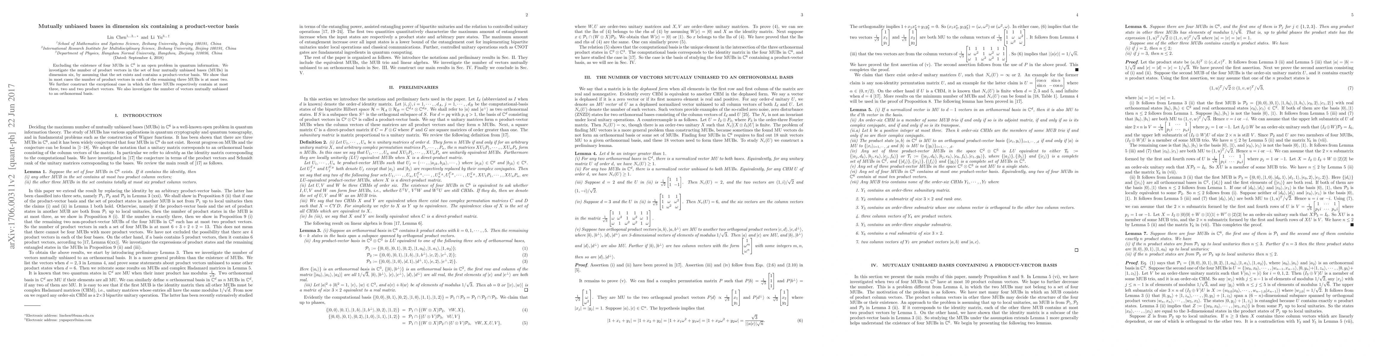Researchers investigate the number of product vectors in a set of four mutually unbiased bases in dimension six, finding that most cases contain at most two product vectors per basis.