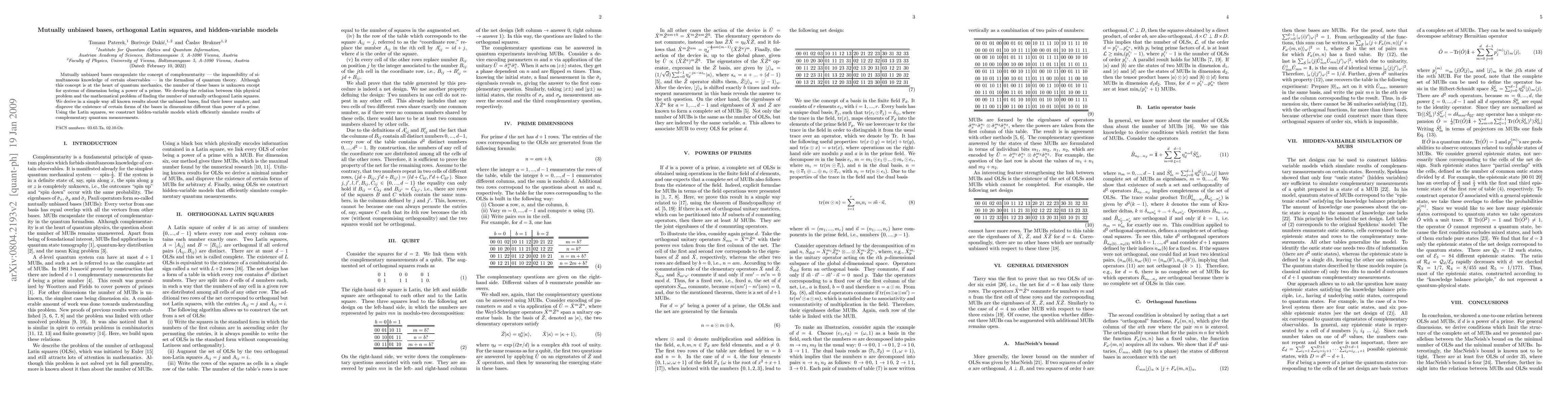 This paper explores the connection between mutually unbiased bases in quantum mechanics and orthogonal Latin squares in mathematics, deriving new results on the number of such bases and constructing hidden-variable models that simulate quantum measurement outcomes. It disproves the existence of certain bases in non-prime power dimensions.