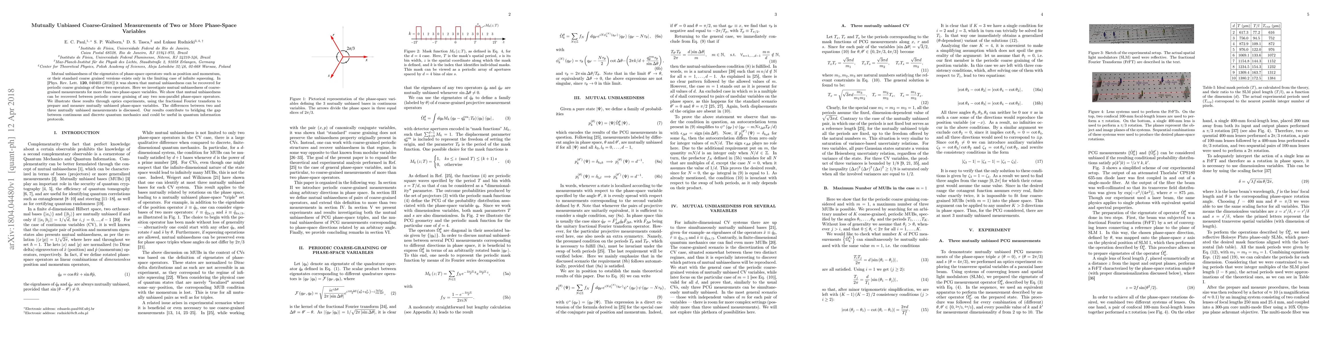 This paper investigates the mutual unbiasedness of coarse-grained measurements for more than two phase-space variables, demonstrating that periodic coarse graining can recover this property for non-parallel operators. Experiments using optics and the fractional Fourier transform illustrate these findings, contributing to the understanding of quantum mechanics and potential applications in quantum information protocols.