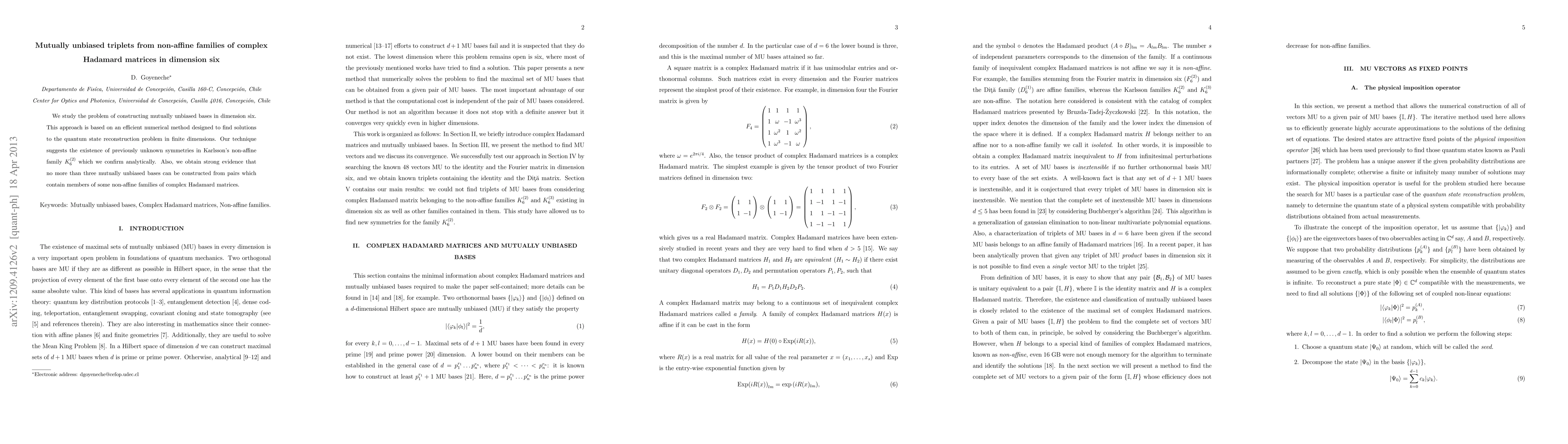 This paper explores the construction of mutually unbiased bases in dimension six, utilizing a numerical method to uncover symmetries in Karlsson's non-affine family $K_6^{(2)}$, and provides evidence that no more than three mutually unbiased bases can be derived from certain non-affine families of complex Hadamard matrices.