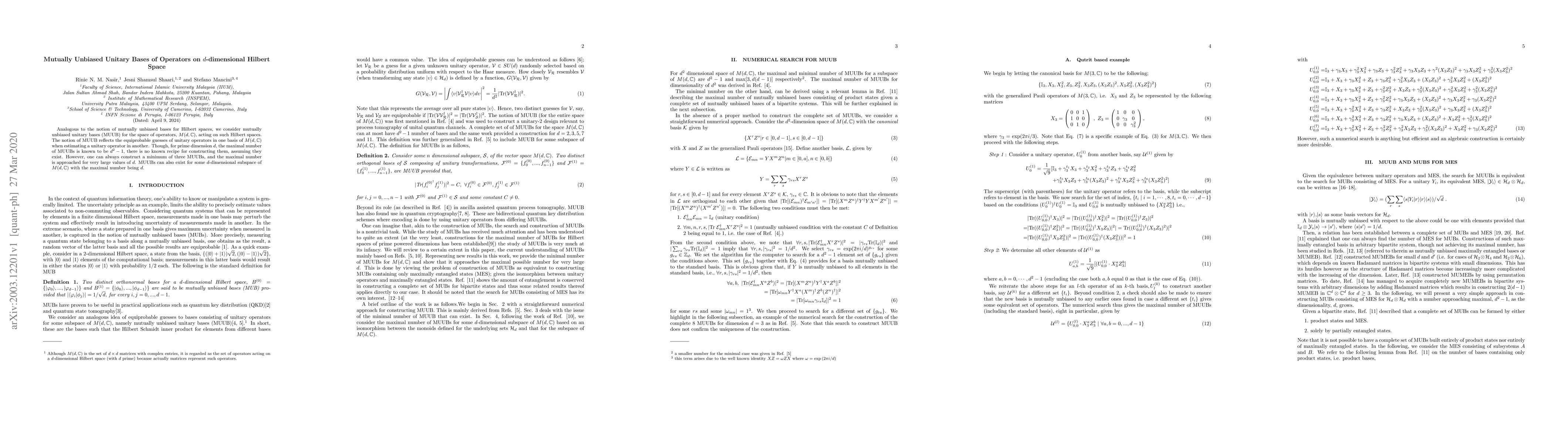 This paper explores mutually unbiased unitary bases (MUUBs) for the operator space $M(d, \mathbb{C})$ on a $d$-dimensional Hilbert space, analogous to mutually unbiased bases for Hilbert spaces. While the maximal number of MUUBs for prime dimension $d$ is $d^{2}-1$, no construction method is known, though at least three MUUBs can always be constructed.