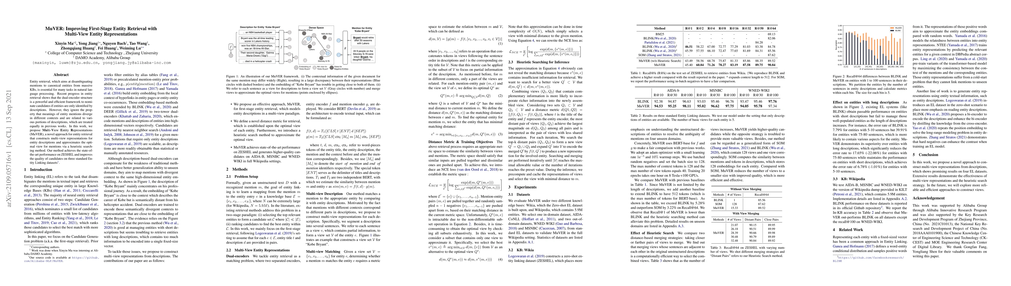 Title: MuVER: Improving First-Stage Entity Retrieval with Multi-View Entity Representations Summary: This paper introduces MuVER, a novel approach that constructs multi-view representations for entity descriptions to better capture context-specific meanings, leading to improved entity retrieval performance and outperforming existing methods on multiple datasets.