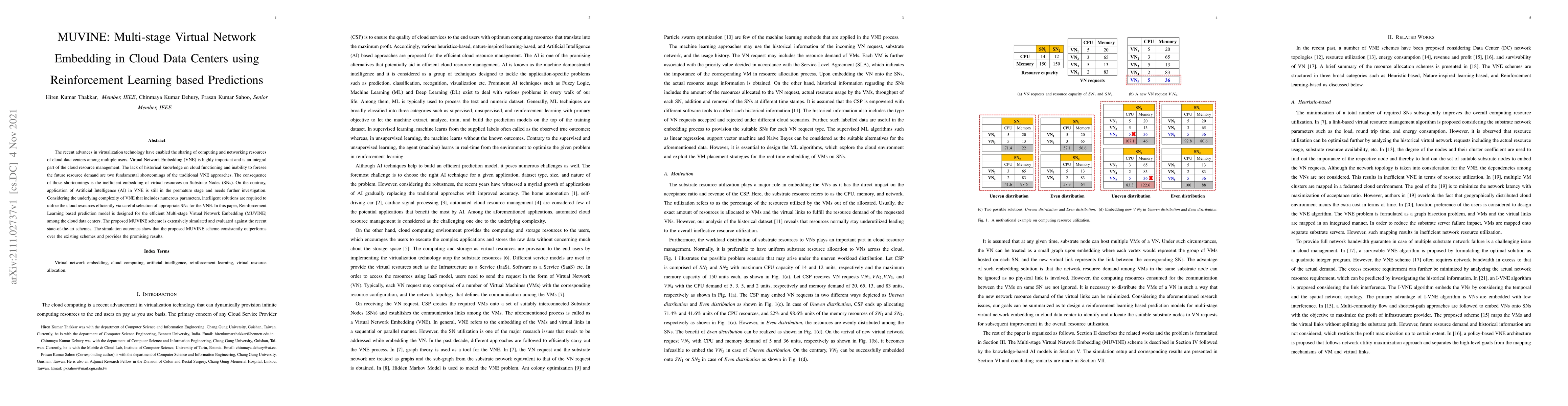 The paper proposes a MUVINE scheme using Reinforcement Learning for efficient Virtual Network Embedding in cloud data centers, addressing the inefficiencies of traditional methods by leveraging AI predictions. Simulation results demonstrate that the proposed method outperforms existing state-of-the-art approaches.
