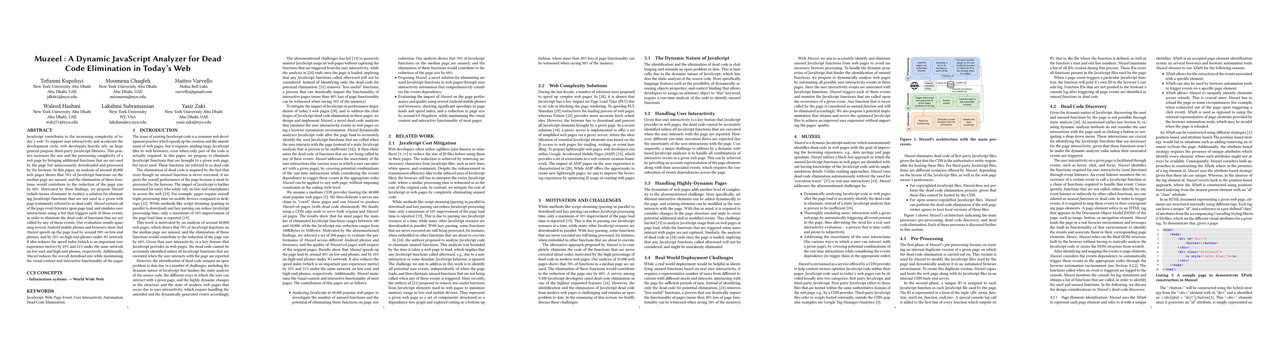 Muzeel is a JavaScript analyzer designed to eliminate unused (dead) code from web pages, significantly reducing their size and processing complexity. Evaluations show it speeds up page load times by 30% on low-end and 25% on high-end phones under 3G, while also improving user experience metrics.