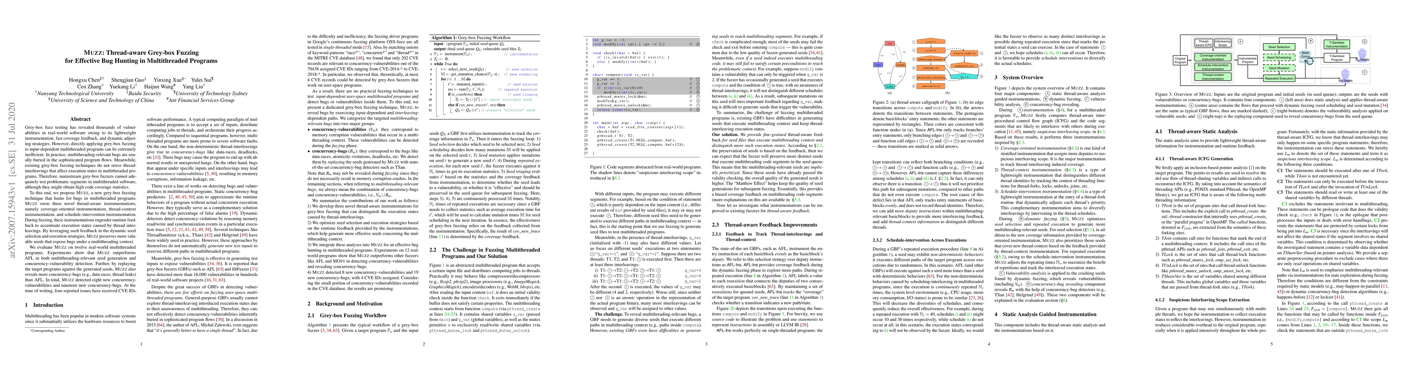 MUZZ is a novel grey-box fuzzing technique designed to effectively identify bugs in multithreaded programs by employing three thread-aware instrumentations. It outperforms AFL in generating multithreading-relevant seeds and detecting concurrency vulnerabilities, revealing 8 new concurrency-vulnerabilities and 19 new concurrency-bugs across 12 real-world software programs.