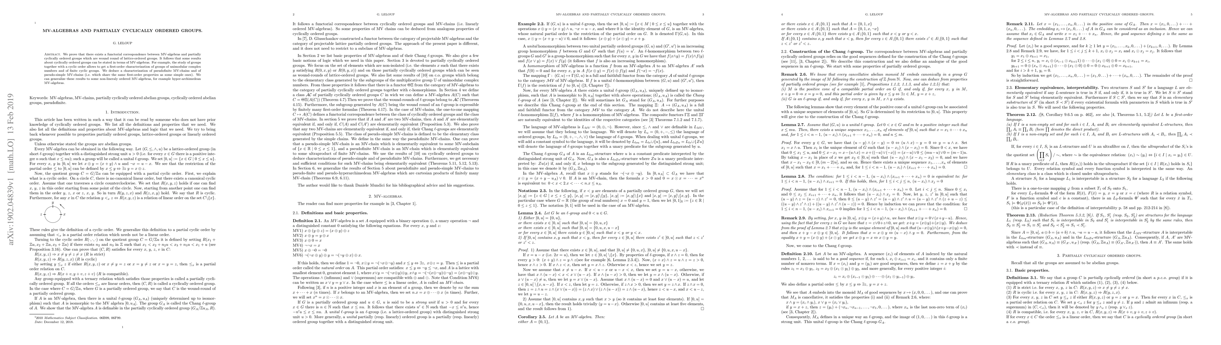 This paper establishes a functorial correspondence between MV-algebras and partially cyclically ordered groups based on lattice-ordered groups, enabling the first-order characterization of groups like unimodular complex numbers and finite cyclic groups through MV-algebras. It also characterizes pseudofinite and pseudo-simple MV-chains and extends these findings to hyper-archimedean MV-algebras.
