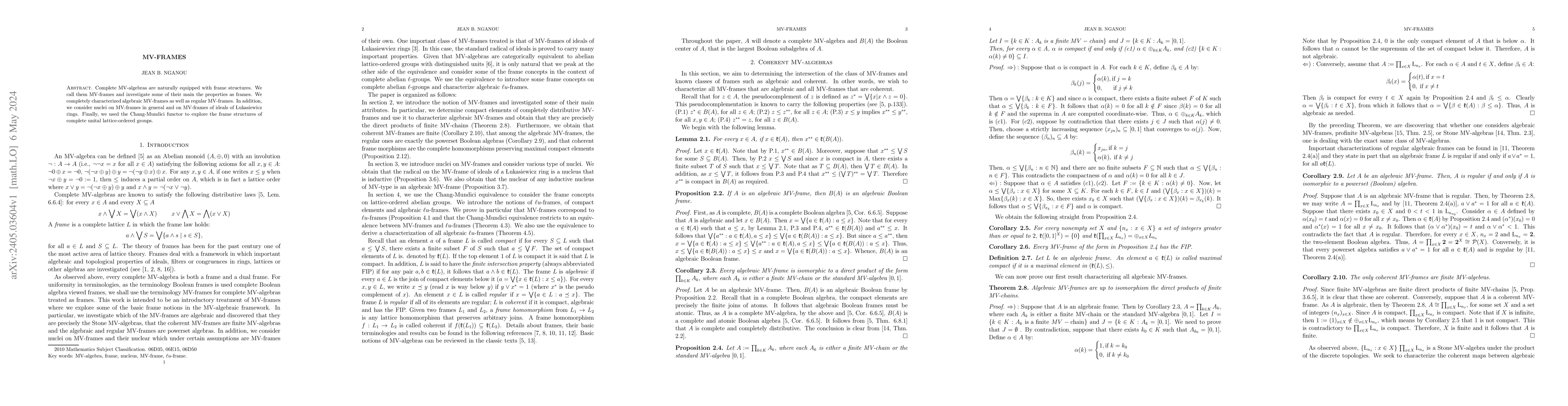 This paper explores MV-frames, the frame structures inherent in complete MV-algebras, characterizing algebraic and regular MV-frames. It also investigates nuclei on MV-frames and applies the Chang-Mundici functor to examine the frame structures of complete unital lattice-ordered groups.