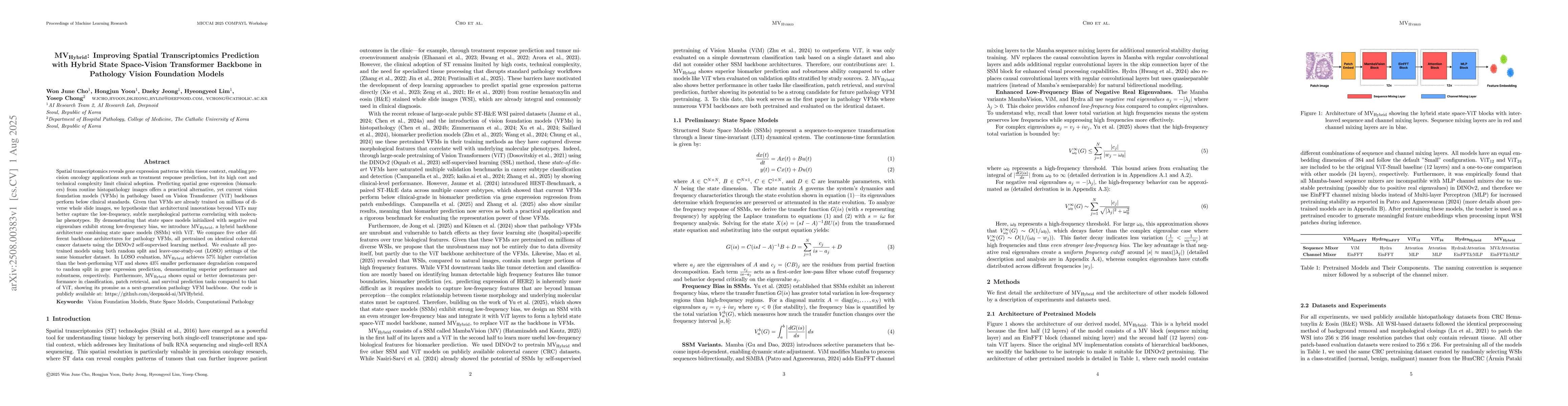 Spatial transcriptomics reveals gene expression patterns within tissue context, enabling precision oncology applications such as treatment response prediction, but its high cost and technical complexity limit clinical adoption. Predicting spatial gene expression (biomarkers) from routine histopathology images offers a practical alternative, yet current vision foundation models (VFMs) in pathology based on Vision Transformer (ViT) backbones perform below clinical standards. Given that VFMs are already trained on millions of diverse whole slide images, we hypothesize that architectural innovations beyond ViTs may better capture the low-frequency, subtle morphological patterns correlating with molecular phenotypes. By demonstrating that state space models initialized with negative real eigenvalues exhibit strong low-frequency bias, we introduce $MV_{Hybrid}$, a hybrid backbone architecture combining state space models (SSMs) with ViT. We compare five other different backbone architectures for pathology VFMs, all pretrained on identical colorectal cancer datasets using the DINOv2 self-supervised learning method. We evaluate all pretrained models using both random split and leave-one-study-out (LOSO) settings of the same biomarker dataset. In LOSO evaluation, $MV_{Hybrid}$ achieves 57% higher correlation than the best-performing ViT and shows 43% smaller performance degradation compared to random split in gene expression prediction, demonstrating superior performance and robustness, respectively. Furthermore, $MV_{Hybrid}$ shows equal or better downstream performance in classification, patch retrieval, and survival prediction tasks compared to that of ViT, showing its promise as a next-generation pathology VFM backbone. Our code is publicly available at: https://github.com/deepnoid-ai/MVHybrid.