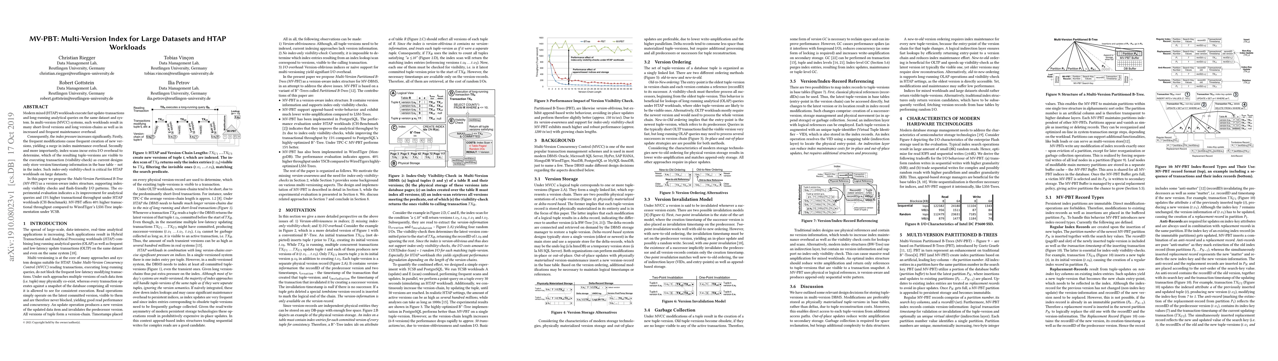 Modern mixed (HTAP) workloads execute fast update-transactions and long-running analytical queries on the same dataset and system. In multi-version (MVCC) systems, such workloads result in many short-lived versions and long version-chains as well as in increased and frequent maintenance overhead. Consequently, the index pressure increases significantly. Firstly, the frequent modifications cause frequent creation of new versions, yielding a surge in index maintenance overhead. Secondly and more importantly, index-scans incur extra I/O overhead to determine, which of the resulting tuple-versions are visible to the executing transaction (visibility-check) as current designs only store version/timestamp information in the base table -- not in the index. Such index-only visibility-check is critical for HTAP workloads on large datasets. In this paper we propose the Multi-Version Partitioned B-Tree (MV-PBT) as a version-aware index structure, supporting index-only visibility checks and flash-friendly I/O patterns. The experimental evaluation indicates a 2x improvement for analytical queries and 15% higher transactional throughput under HTAP workloads (CH-Benchmark). MV-PBT offers 40% higher transactional throughput compared to WiredTiger's LSM-Tree implementation under YCSB.