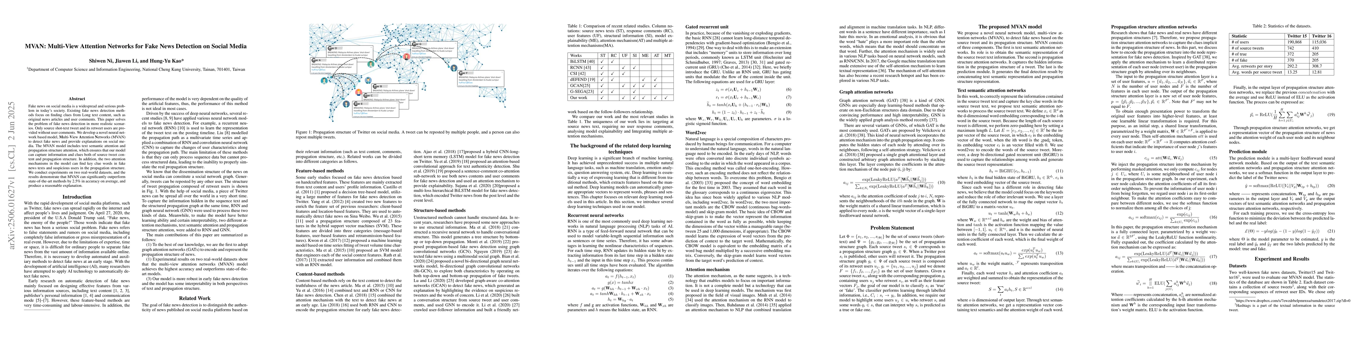 This work stands out by focusing on detecting fake news using only source tweets and retweet users, introducing a novel attention-based neural network model (MVAN) that captures both content and structural information.