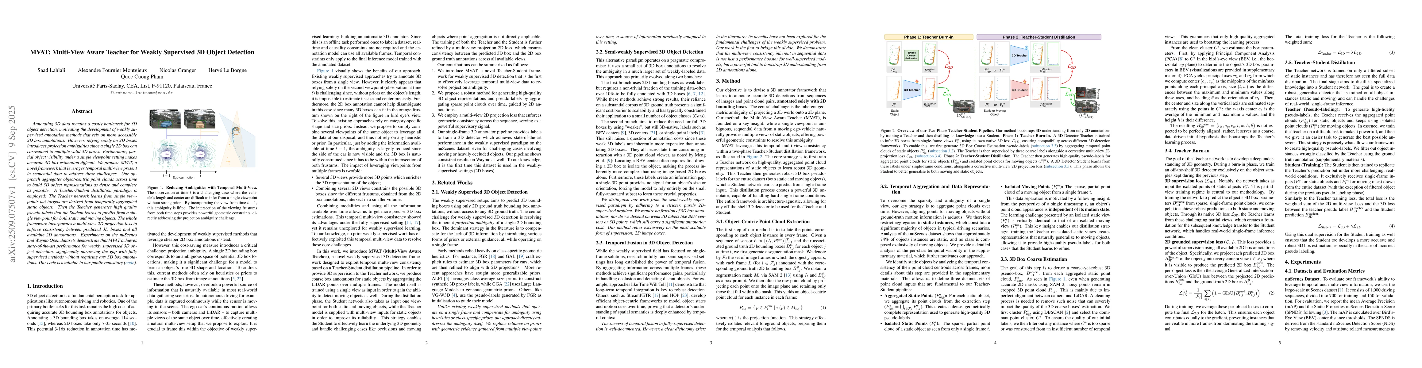 Annotating 3D data remains a costly bottleneck for 3D object detection, motivating the development of weakly supervised annotation methods that rely on more accessible 2D box annotations. However, relying solely on 2D boxes introduces projection ambiguities since a single 2D box can correspond to multiple valid 3D poses. Furthermore, partial object visibility under a single viewpoint setting makes accurate 3D box estimation difficult. We propose MVAT, a novel framework that leverages temporal multi-view present in sequential data to address these challenges. Our approach aggregates object-centric point clouds across time to build 3D object representations as dense and complete as possible. A Teacher-Student distillation paradigm is employed: The Teacher network learns from single viewpoints but targets are derived from temporally aggregated static objects. Then the Teacher generates high quality pseudo-labels that the Student learns to predict from a single viewpoint for both static and moving objects. The whole framework incorporates a multi-view 2D projection loss to enforce consistency between predicted 3D boxes and all available 2D annotations. Experiments on the nuScenes and Waymo Open datasets demonstrate that MVAT achieves state-of-the-art performance for weakly supervised 3D object detection, significantly narrowing the gap with fully supervised methods without requiring any 3D box annotations. % \footnote{Code available upon acceptance} Our code is available in our public repository (\href{https://github.com/CEA-LIST/MVAT}{code}).