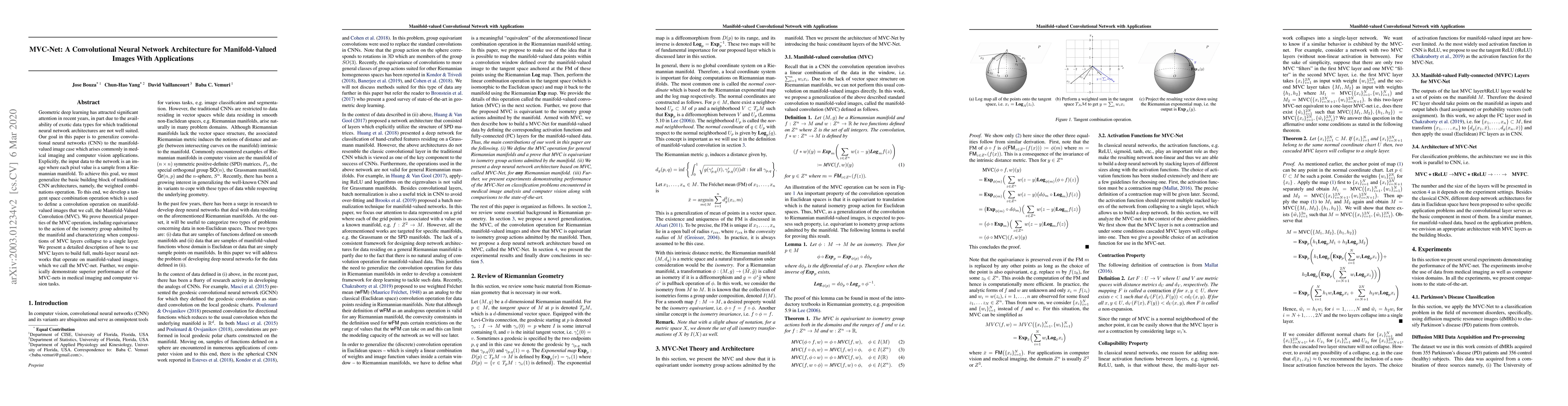 MVC-Net extends convolutional neural networks to handle manifold-valued images, introducing a novel Tangent Space Combination operation for convolution. This approach demonstrates superior performance in medical imaging and computer vision tasks.