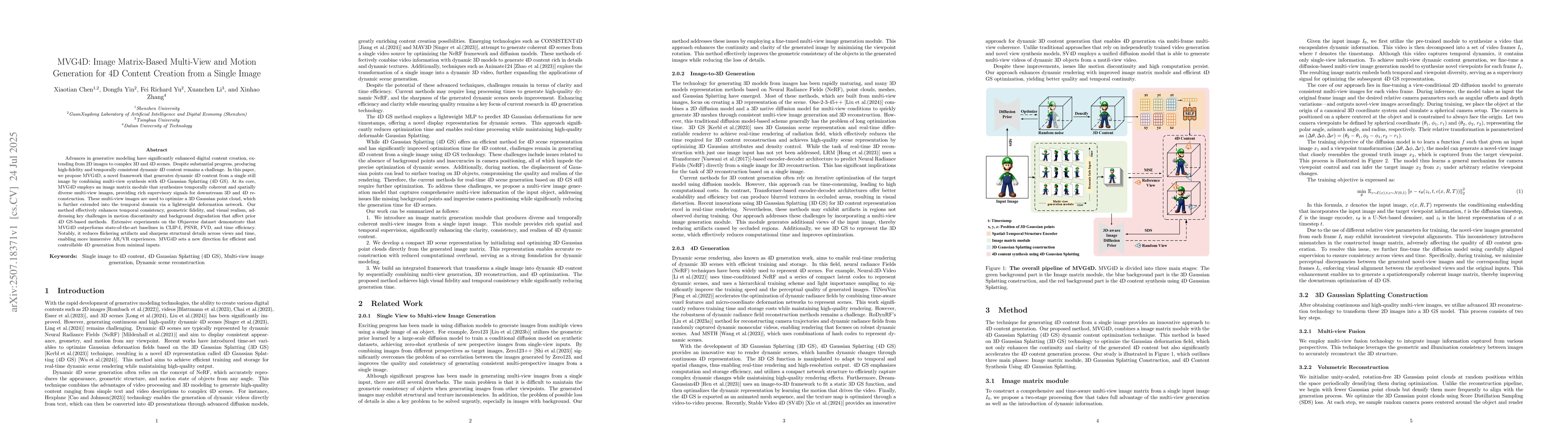 Advances in generative modeling have significantly enhanced digital content creation, extending from 2D images to complex 3D and 4D scenes. Despite substantial progress, producing high-fidelity and temporally consistent dynamic 4D content remains a challenge. In this paper, we propose MVG4D, a novel framework that generates dynamic 4D content from a single still image by combining multi-view synthesis with 4D Gaussian Splatting (4D GS). At its core, MVG4D employs an image matrix module that synthesizes temporally coherent and spatially diverse multi-view images, providing rich supervisory signals for downstream 3D and 4D reconstruction. These multi-view images are used to optimize a 3D Gaussian point cloud, which is further extended into the temporal domain via a lightweight deformation network. Our method effectively enhances temporal consistency, geometric fidelity, and visual realism, addressing key challenges in motion discontinuity and background degradation that affect prior 4D GS-based methods. Extensive experiments on the Objaverse dataset demonstrate that MVG4D outperforms state-of-the-art baselines in CLIP-I, PSNR, FVD, and time efficiency. Notably, it reduces flickering artifacts and sharpens structural details across views and time, enabling more immersive AR/VR experiences. MVG4D sets a new direction for efficient and controllable 4D generation from minimal inputs.