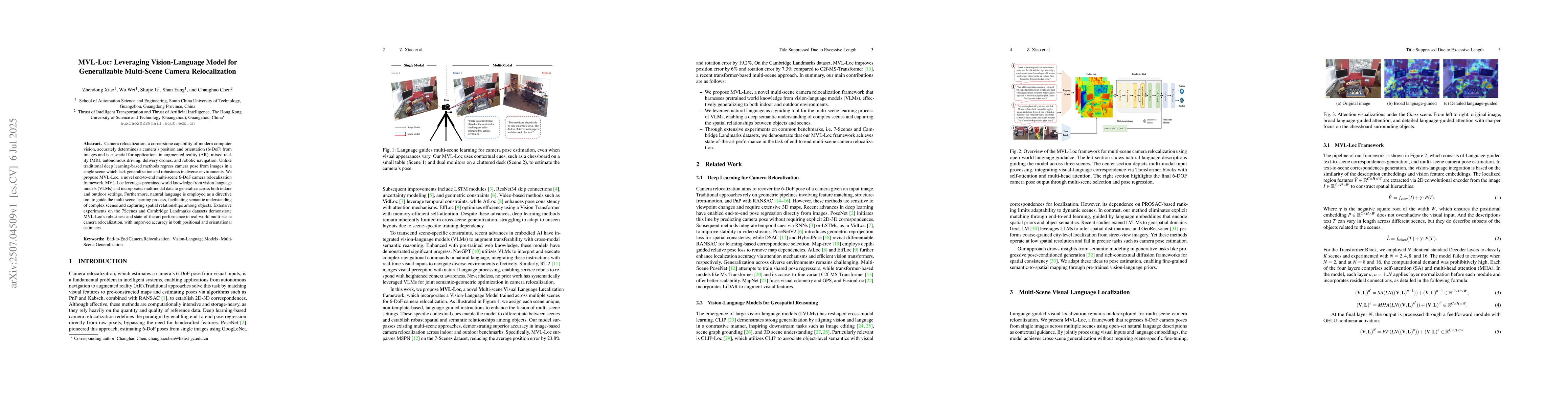 Camera relocalization, a cornerstone capability of modern computer vision, accurately determines a camera's position and orientation (6-DoF) from images and is essential for applications in augmented reality (AR), mixed reality (MR), autonomous driving, delivery drones, and robotic navigation. Unlike traditional deep learning-based methods that regress camera pose from images in a single scene, which often lack generalization and robustness in diverse environments, we propose MVL-Loc, a novel end-to-end multi-scene 6-DoF camera relocalization framework. MVL-Loc leverages pretrained world knowledge from vision-language models (VLMs) and incorporates multimodal data to generalize across both indoor and outdoor settings. Furthermore, natural language is employed as a directive tool to guide the multi-scene learning process, facilitating semantic understanding of complex scenes and capturing spatial relationships among objects. Extensive experiments on the 7Scenes and Cambridge Landmarks datasets demonstrate MVL-Loc's robustness and state-of-the-art performance in real-world multi-scene camera relocalization, with improved accuracy in both positional and orientational estimates.