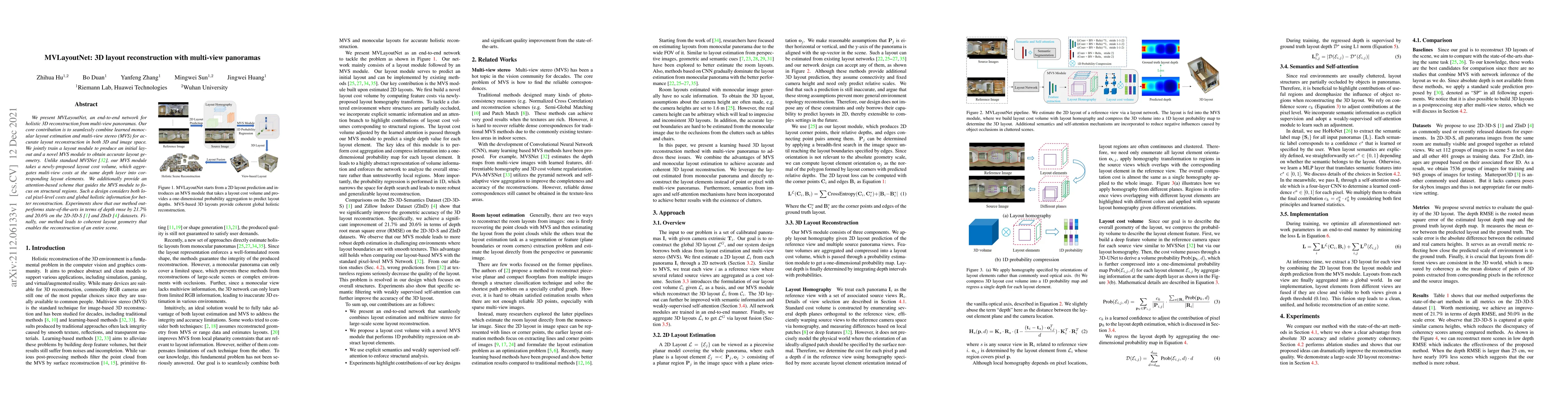 MVLayoutNet integrates monocular layout estimation with multi-view stereo to reconstruct accurate 3D layouts from panoramas, outperforming existing methods by 21.7% and 20.6% in depth rmse on benchmark datasets. The method combines a layout module and an MVS module, utilizing a layout cost volume and attention-based guidance for improved reconstruction.