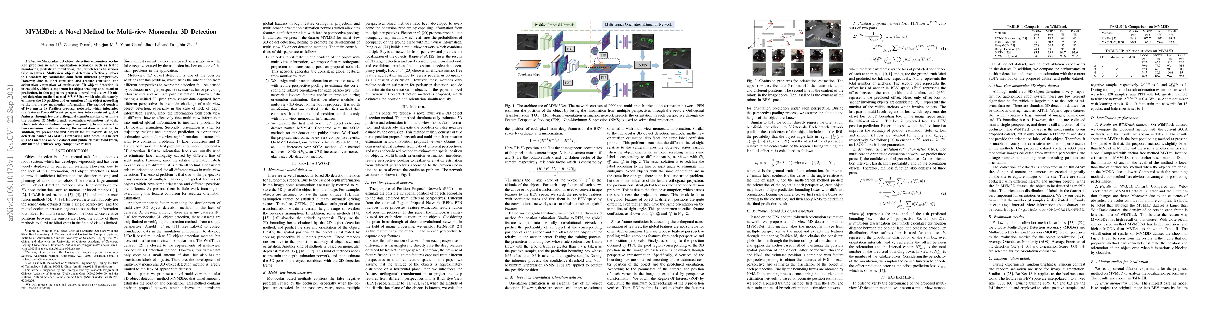 MVM3Det is a novel method for multi-view monocular 3D object detection that addresses occlusion problems by combining data from different perspectives. It estimates both 3D position and orientation using a position proposal network and a multi-branch orientation estimation network, achieving competitive results compared to state-of-the-art methods.