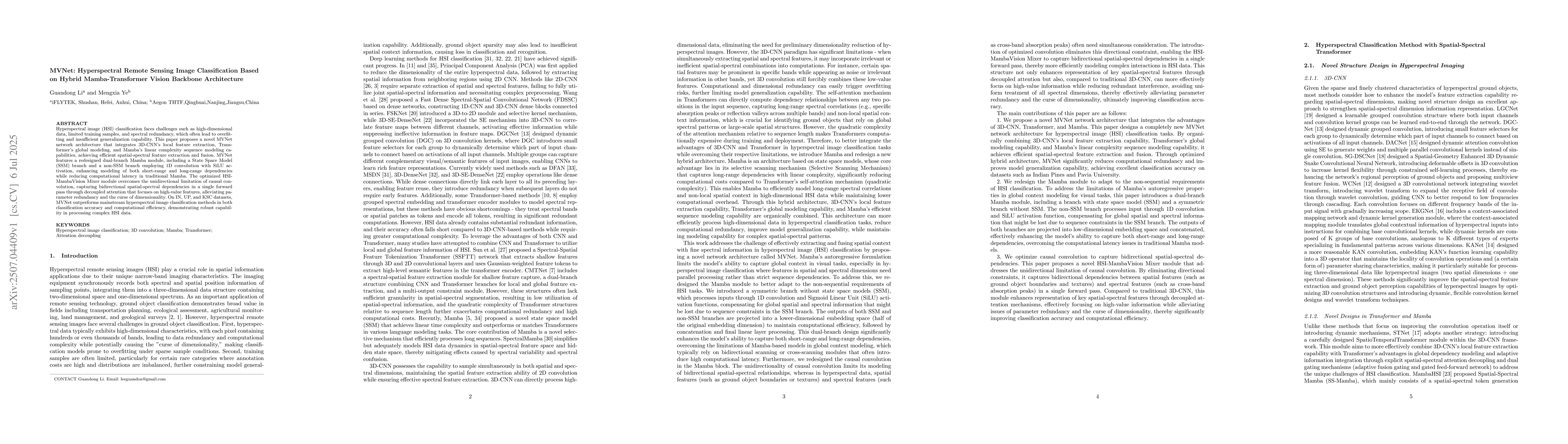 Hyperspectral image (HSI) classification faces challenges such as high-dimensional data, limited training samples, and spectral redundancy, which often lead to overfitting and insufficient generalization capability. This paper proposes a novel MVNet network architecture that integrates 3D-CNN's local feature extraction, Transformer's global modeling, and Mamba's linear complexity sequence modeling capabilities, achieving efficient spatial-spectral feature extraction and fusion. MVNet features a redesigned dual-branch Mamba module, including a State Space Model (SSM) branch and a non-SSM branch employing 1D convolution with SiLU activation, enhancing modeling of both short-range and long-range dependencies while reducing computational latency in traditional Mamba. The optimized HSI-MambaVision Mixer module overcomes the unidirectional limitation of causal convolution, capturing bidirectional spatial-spectral dependencies in a single forward pass through decoupled attention that focuses on high-value features, alleviating parameter redundancy and the curse of dimensionality. On IN, UP, and KSC datasets, MVNet outperforms mainstream hyperspectral image classification methods in both classification accuracy and computational efficiency, demonstrating robust capability in processing complex HSI data.