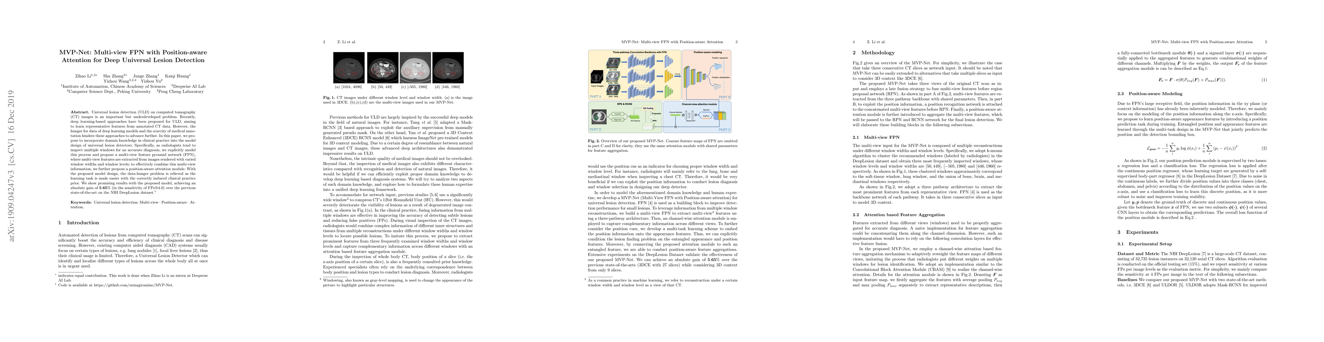 MVP-Net introduces a multi-view feature pyramid network with a position-aware attention module to enhance universal lesion detection in CT images, addressing data scarcity by incorporating domain knowledge. The model achieves a 5.65% improvement in sensitivity over previous methods on the NIH DeepLesion dataset.