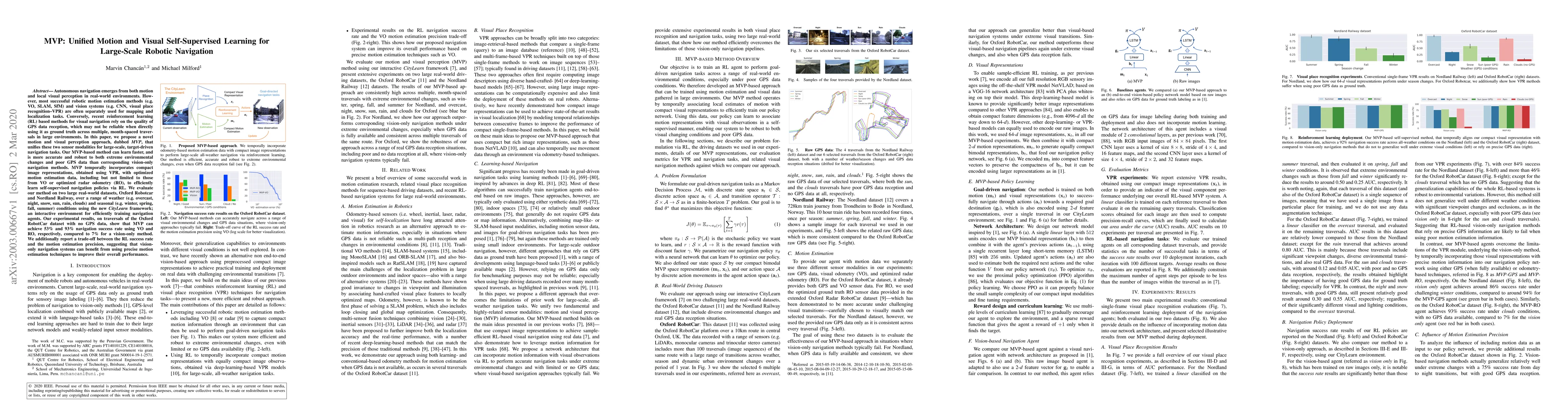 A new navigation method called MVP combines motion estimation with visual self-supervised learning to improve robotic navigation accuracy and robustness in large environments without relying on GPS data. The method outperforms existing vision-only methods by achieving higher navigation success rates and better performance in various weather and seasonal conditions.