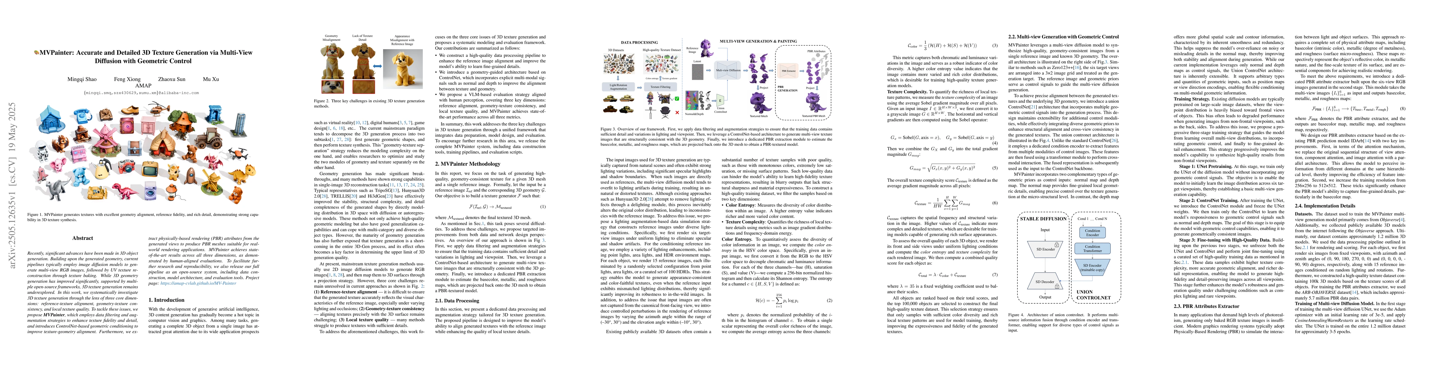 The research paper introduces MVPainter, a method that enhances 3D texture generation using multi-view diffusion with geometric control. MVPainter outperforms existing methods by focusing on reference-texture alignment, geometry-texture consistency, and local texture quality, achieving state-of-the-art results. The system, including data construction, model architecture, and evaluation tools, is made open-source for further research and reproducibility.