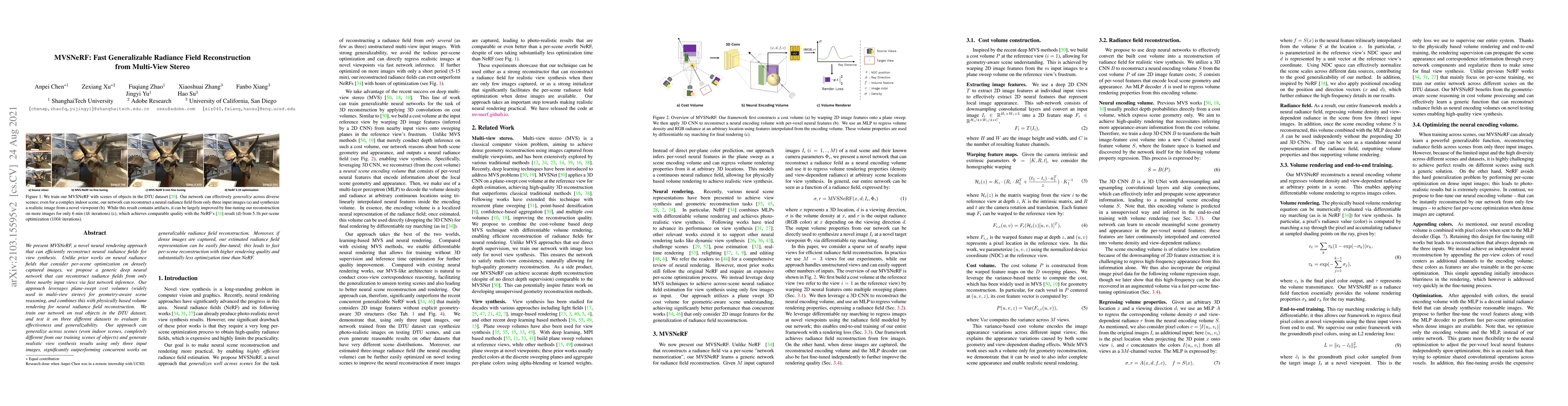 We present MVSNeRF, a novel neural rendering approach that can efficiently reconstruct neural radiance fields for view synthesis. Unlike prior works on neural radiance fields that consider per-scene optimization on densely captured images, we propose a generic deep neural network that can reconstruct radiance fields from only three nearby input views via fast network inference. Our approach leverages plane-swept cost volumes (widely used in multi-view stereo) for geometry-aware scene reasoning, and combines this with physically based volume rendering for neural radiance field reconstruction. We train our network on real objects in the DTU dataset, and test it on three different datasets to evaluate its effectiveness and generalizability. Our approach can generalize across scenes (even indoor scenes, completely different from our training scenes of objects) and generate realistic view synthesis results using only three input images, significantly outperforming concurrent works on generalizable radiance field reconstruction. Moreover, if dense images are captured, our estimated radiance field representation can be easily fine-tuned; this leads to fast per-scene reconstruction with higher rendering quality and substantially less optimization time than NeRF.