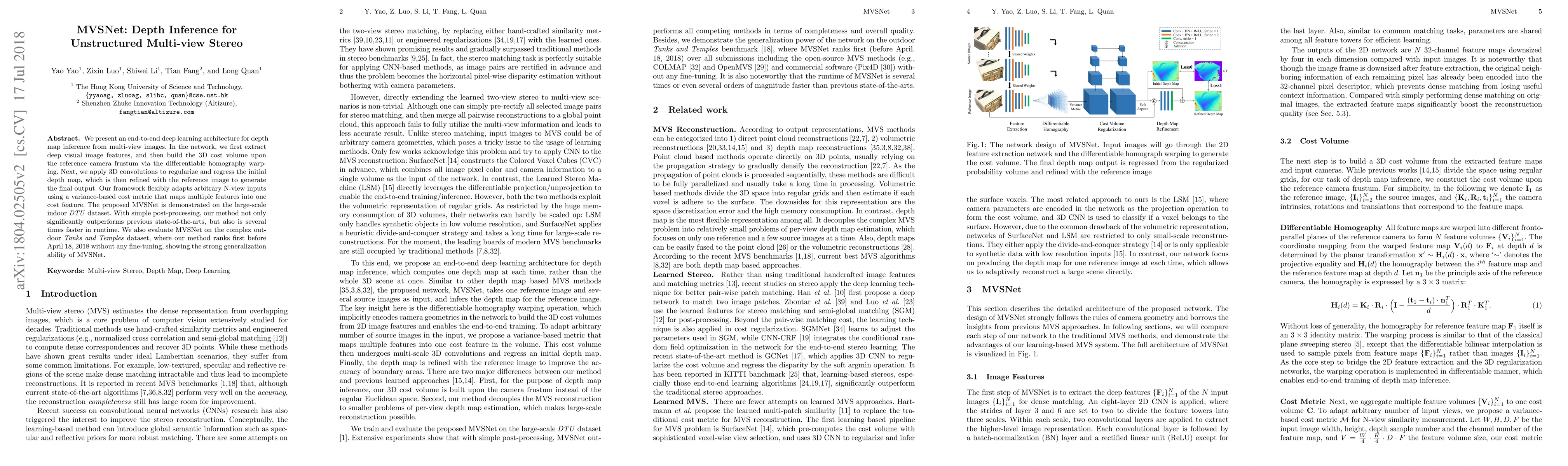 MVSNet is an end-to-end deep learning architecture for depth map inference from multi-view images, utilizing 3D convolutions and a variance-based cost metric to adapt to any number of views. It outperforms previous methods on both indoor and outdoor datasets, demonstrating strong generalization and faster runtime.