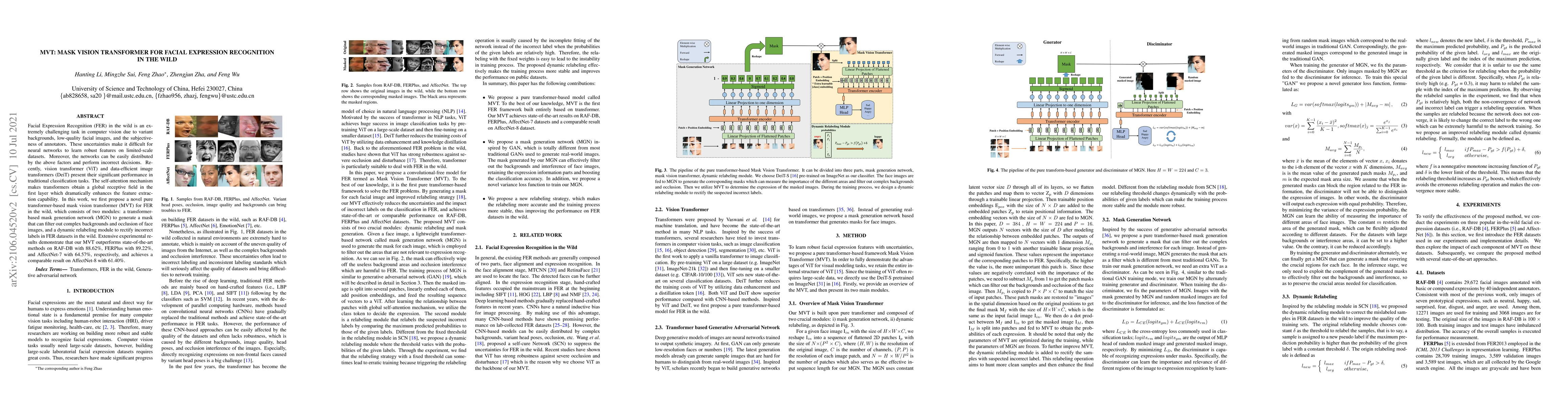 The paper proposes a Mask Vision Transformer (MVT) for facial expression recognition in challenging real-world conditions, utilizing a transformer-based mask generation network to filter backgrounds and occlusions, and a dynamic relabeling module to correct dataset labels. Experimental results show MVT outperforms state-of-the-art methods on several datasets, achieving high accuracy in diverse environments.