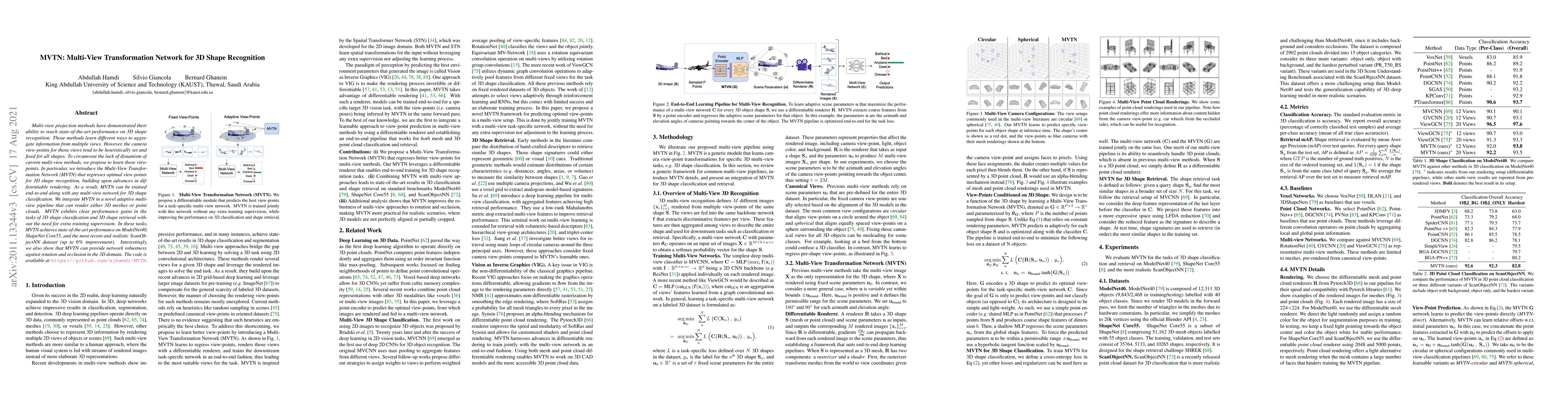 The paper proposes MVTN, a Multi-View Transformation Network that learns optimal viewpoints for 3D shape recognition, integrating it into an adaptive multi-view pipeline for rendering 3D meshes or point clouds. MVTN is trained end-to-end with any multi-view network for 3D shape classification.