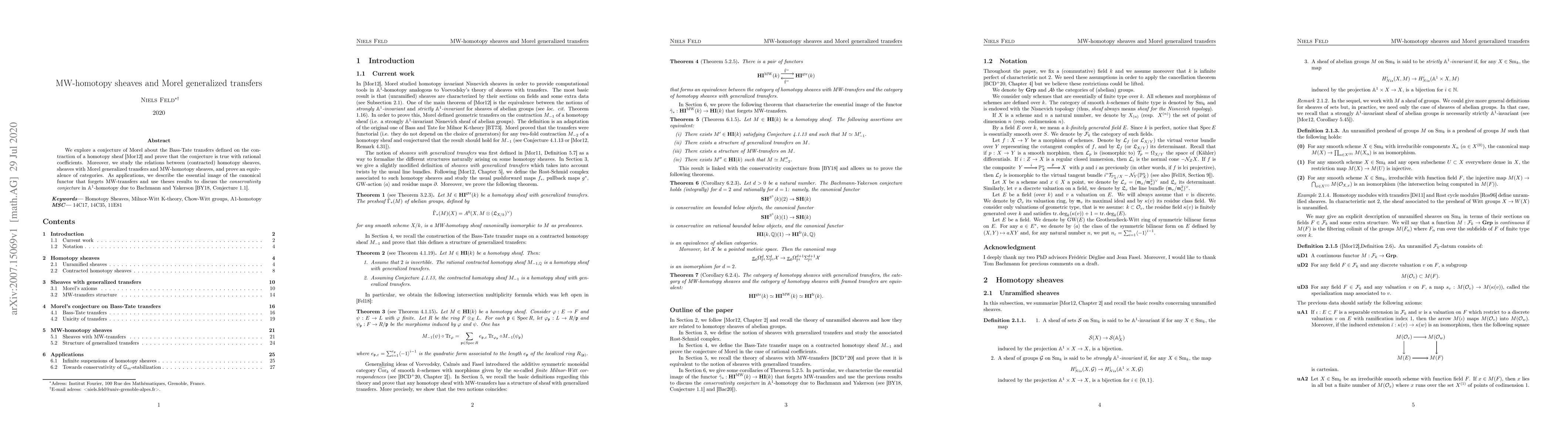 This paper proves Morel's conjecture on Bass-Tate transfers defined on homotopy sheaves with rational coefficients, and establishes an equivalence between contracted homotopy sheaves, sheaves with Morel generalized transfers, and MW-homotopy sheaves. The findings also address the conservativity conjecture in A^1-homotopy theory.