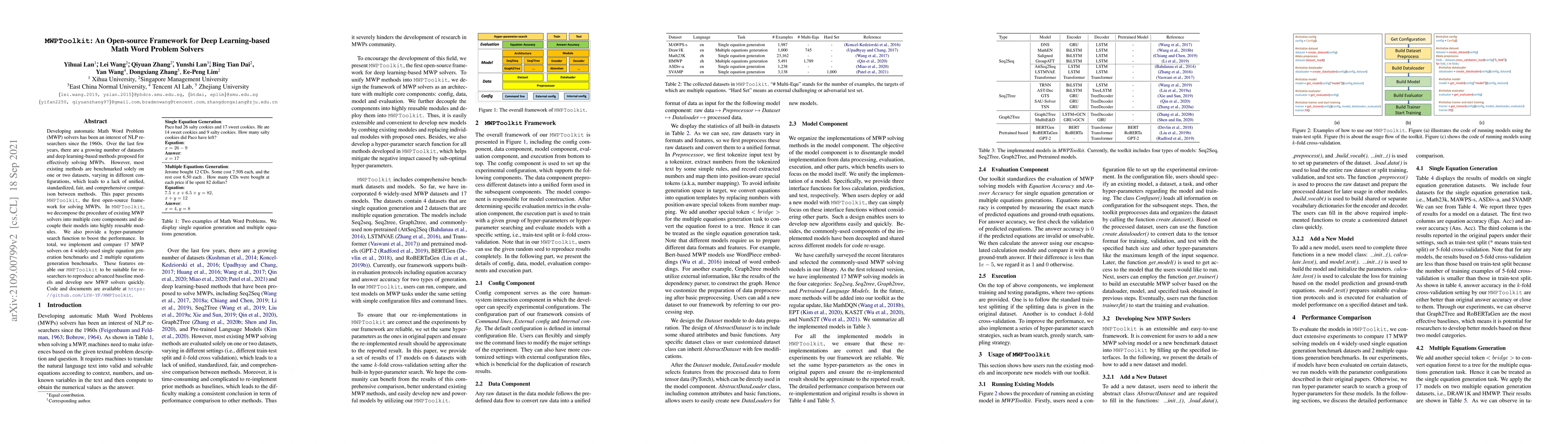 MWPToolkit is an open-source framework designed to facilitate the development and comparison of deep learning-based Math Word Problem solvers. It decomposes existing solvers into reusable modules and provides a comprehensive benchmarking of 17 solvers across multiple datasets.