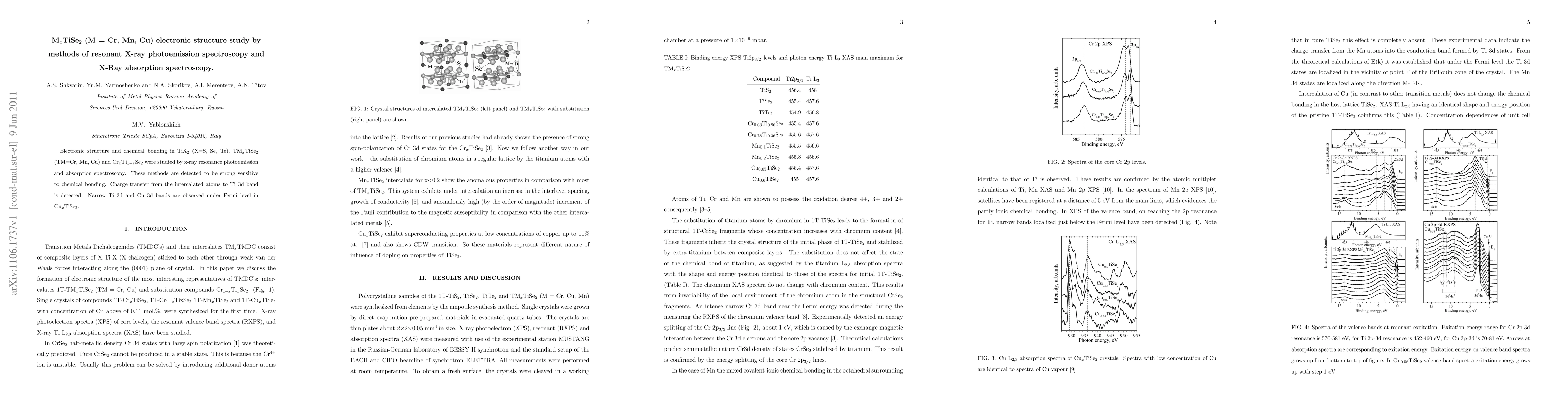 **Summary:** Research uses resonant X-ray photoemission and absorption spectroscopy to analyze the electronic structure of TMxTiSe2 (TM=Cr, Mn, Cu) and CrxTi1-xSe2 compounds, revealing charge transfer from intercalated atoms to Ti 3d bands and identifying narrow Ti 3d and Cu 3d bands near the Fermi level in CuxTiSe2.
