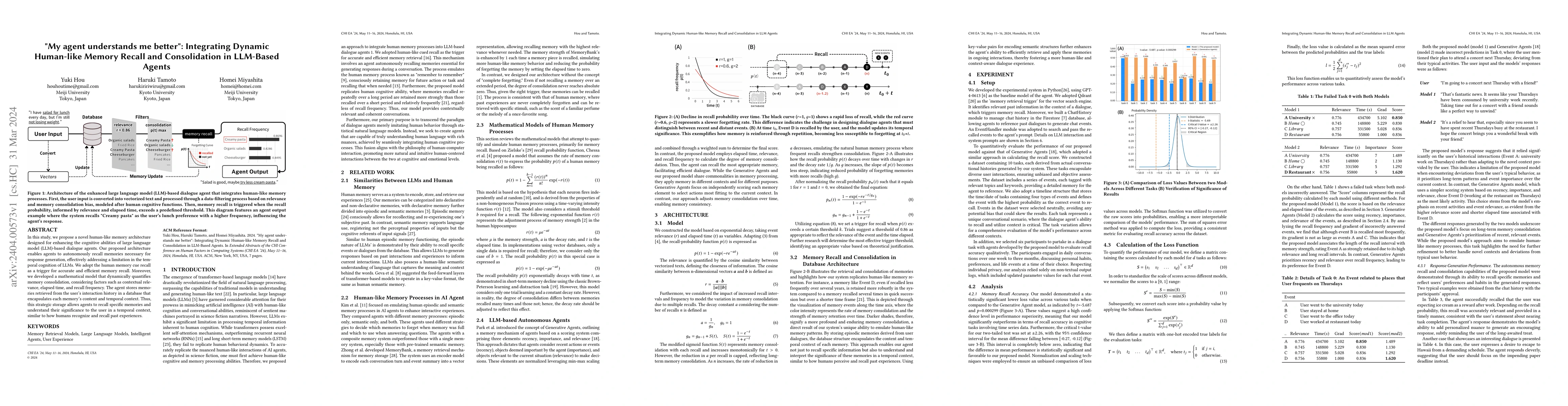 This paper introduces a human-like memory architecture for large language model agents, enabling autonomous memory recall and consolidation based on contextual cues. It also presents a mathematical model for dynamic memory consolidation, enhancing agents' understanding of temporal contexts and interactions.