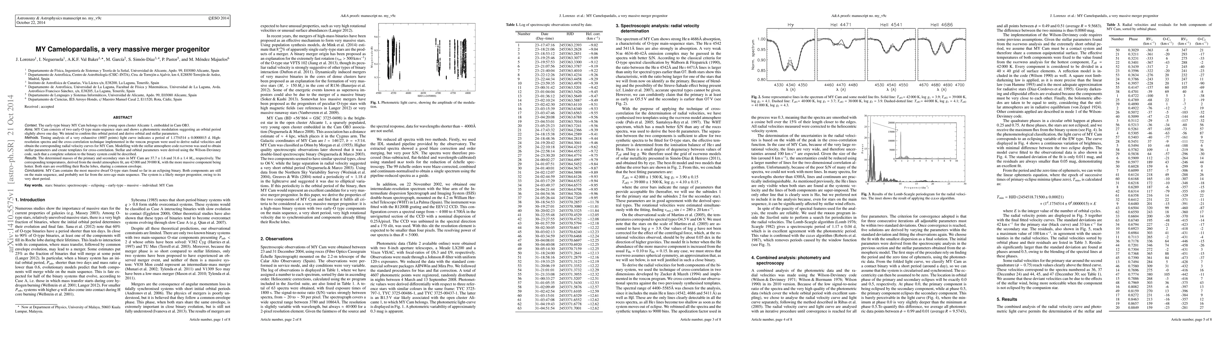 Context. The early-type binary MY Cam belongs to the young open cluster Alicante 1, embedded in Cam OB3. Aims. MY Cam consists of two early-O type main-sequence stars and shows a photometric modulation suggesting an orbital period slightly above one day. We intend to confirm this orbital period and derive orbital and stellar parameters. Methods. Timing analysis of a very exhaustive (4607 points) light curve indicates a period of 1.1754514 +- 0.0000015 d. High- resolution spectra and the cross-correlation technique implemented in the TODCOR program were used to derive radial velocities and obtain the corresponding radial velocity curves for MY Cam. Modelling with the stellar atmosphere code FASTWIND was used to obtain stellar parameters and create templates for cross-correlation. Stellar and orbital parameters were derived using the Wilson-Devinney code, such that a complete solution to the binary system could be described. Results. The determined masses of the primary and secondary stars in MY Cam are 37.7 +- 1.6 and 31.6 +- 1.4 Msol, respectively. The corresponding temperatures, derived from the model atmosphere fit, are 42 000 and 39 000 K, with the more massive component being hotter. Both stars are overfilling their Roche lobes, sharing a common envelope. Conclusions. MY Cam contains the most massive dwarf O-type stars found so far in an eclipsing binary. Both components are still on the main sequence, and probably not far from the zero-age main sequence. The system is a likely merger progenitor, owing to its very short period.