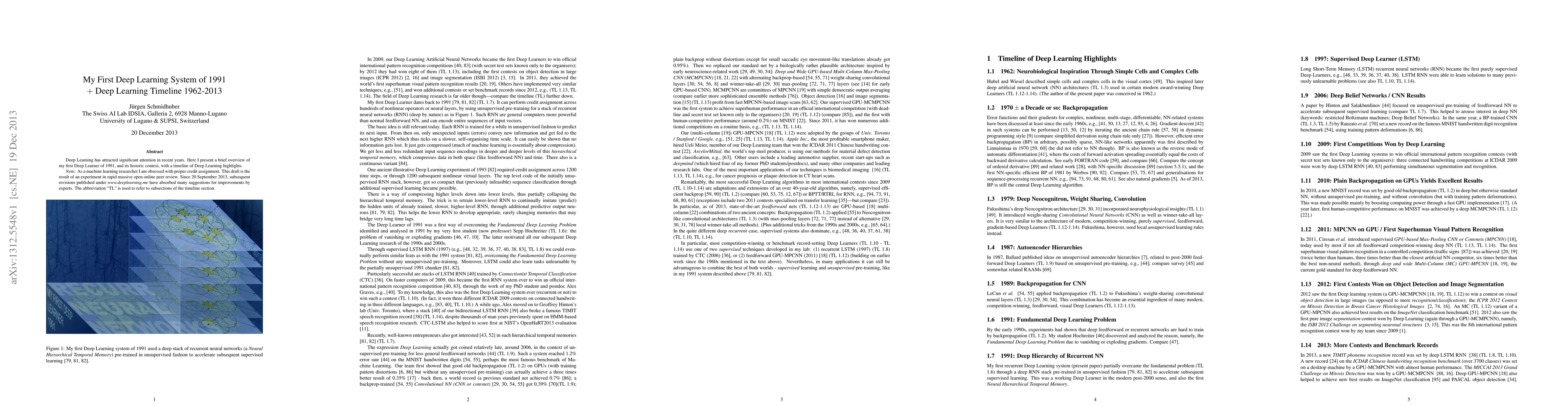 The paper recounts the author's first Deep Learning system from 1991, providing a historical perspective. It also outlines a timeline of key Deep Learning milestones from 1962 to 2013.