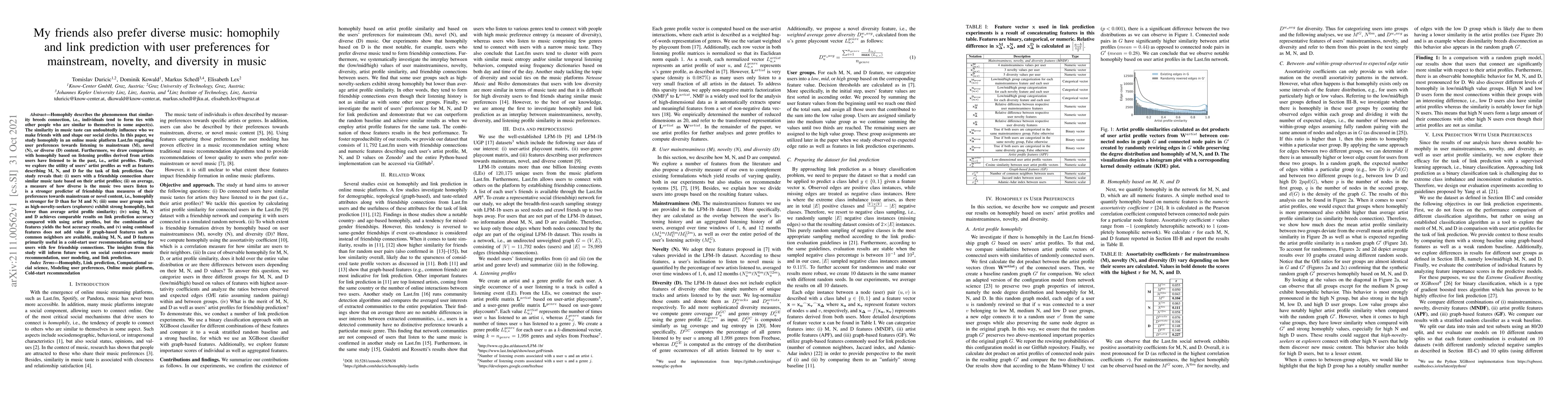 This paper examines homophily in music preferences on Last.fm, showing that friends tend to share similar music tastes, particularly towards diverse content. It finds that diverse music preferences are better predictors of friendships than mainstream or novel content, and that combined features of music diversity, mainstream, and novelty achieve optimal link prediction accuracy.