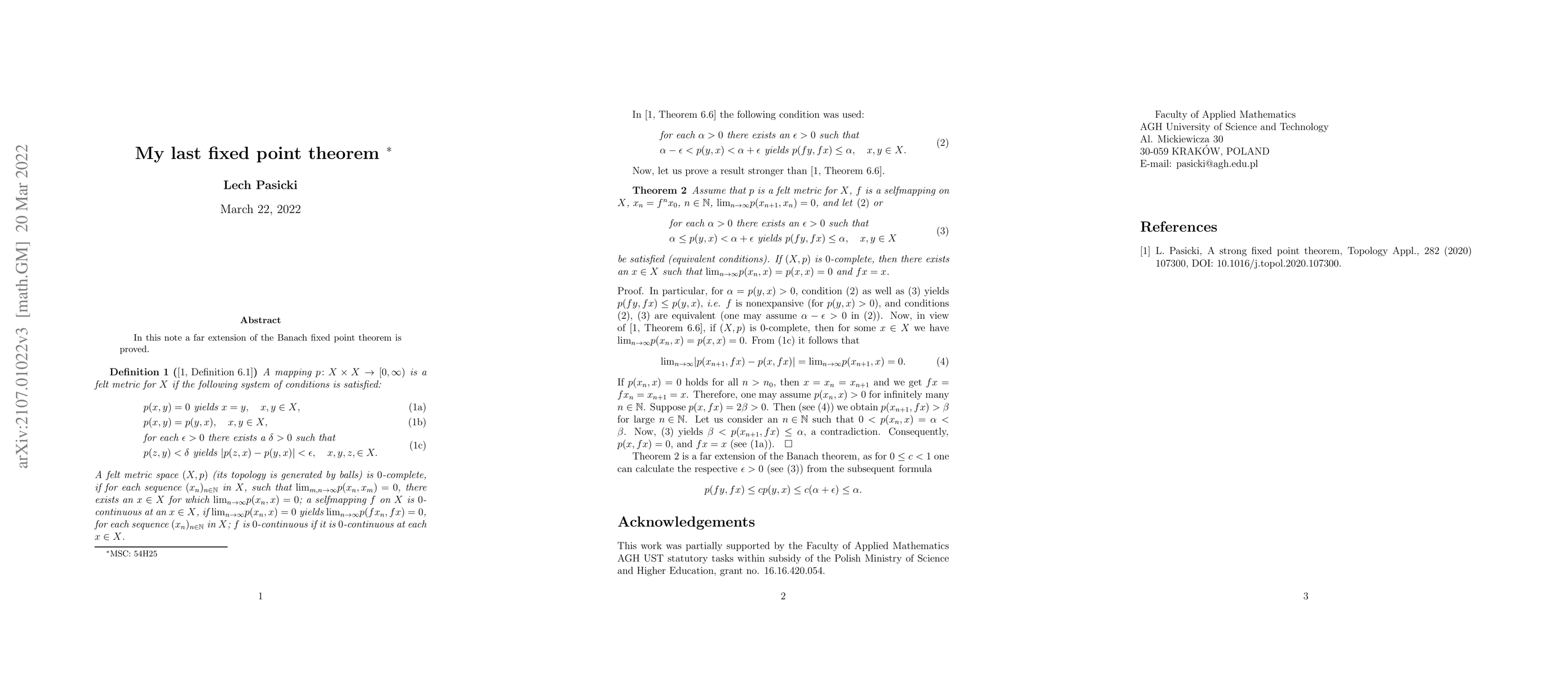 Summary: This paper extends the Banach fixed point theorem significantly, providing a new fixed point result applicable in broader contexts. The extended theorem offers enhanced applicability in various mathematical and applied fields.