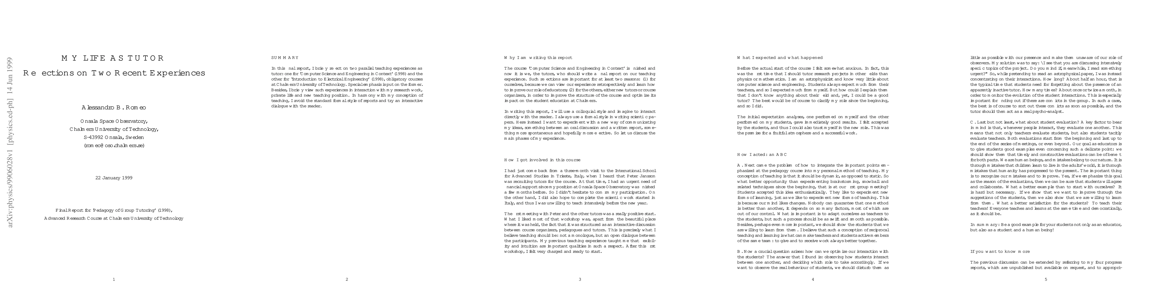 In this final report, I briefly reflect on two parallel teaching experiences as tutor. Besides, I briefly view such experiences in interaction with my research work, private life and new teaching position. In harmony with my conception of teaching, I avoid the standard formal style of reports and try an interactive dialogue with the reader.