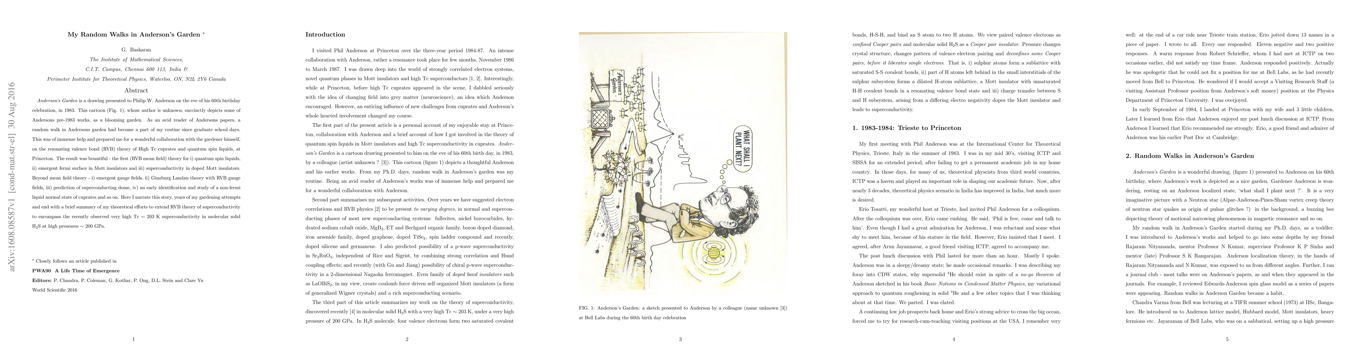 Anderson's Garden is a drawing presented to Philip W. Anderson on the eve of his 60th birthday celebration, in 1983. This cartoon (Fig. 1), whose author is unknown, succinctly depicts some of Anderson's pre-1983 works, as a blooming garden. As an avid reader of Anderson's papers, random walk in Anderson's garden had become a part of my routine since graduate school days. This was of immense help and prepared me for a wonderful collaboration with the gardener himself, on the resonating valence bond (RVB) theory of High Tc cuprates and quantum spin liquids, at Princeton. The result was bountiful - the first (RVB mean field) theory for i) quantum spin liquids, ii) emergent fermi surfaces in Mott insulators and iii) superconductivity in doped Mott insulators. Beyond mean field theory - i) emergent gauge fields, ii) Ginzbuerg Landau theory with RVB gauge fields, iii) prediction of superconducting dome, iv) an early identification and study of a non-fermi liquid normal state of cuprates and so on. Here I narrate this story, years of my gardening attempts and end with a brief summary of my theoretical efforts to extend RVB theory of superconductivity to encompass the recently observed very high Tc ~ 203 K superconductivity in molecular solid H2S at high pressures ~ 200 GPa.