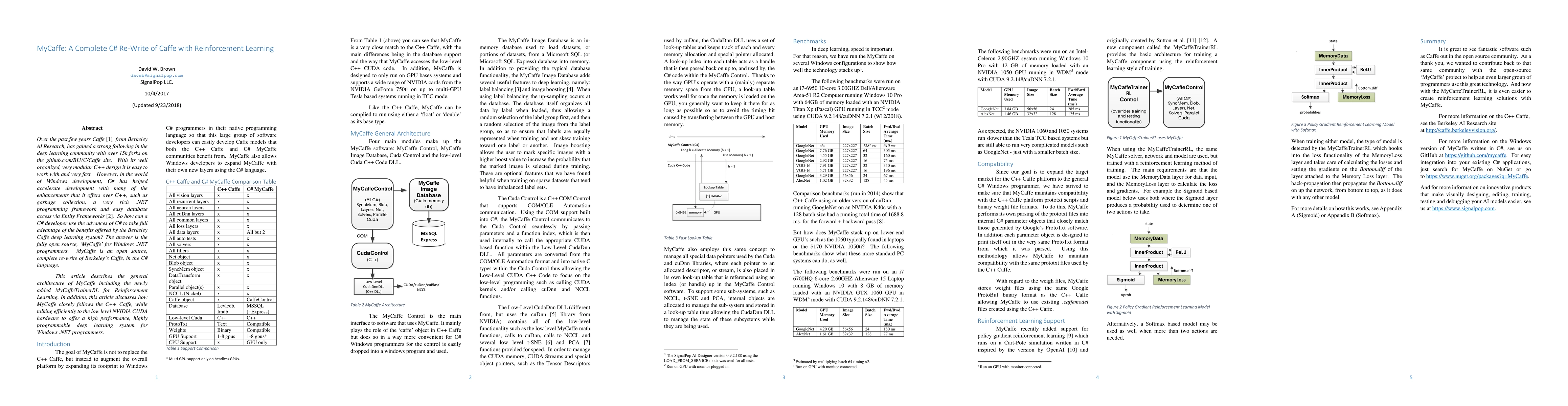 Over the past few years Caffe, from Berkeley AI Research, has gained a strong following in the deep learning community with over 15K forks on the github.com/BLVC/Caffe site. With its well organized, very modular C++ design it is easy to work with and very fast. However, in the world of Windows development, C# has helped accelerate development with many of the enhancements that it offers over C++, such as garbage collection, a very rich .NET programming framework and easy database access via Entity Frameworks. So how can a C# developer use the advances of C# to take full advantage of the benefits offered by the Berkeley Caffe deep learning system? The answer is the fully open source, 'MyCaffe' for Windows .NET programmers. MyCaffe is an open source, complete C# language re-write of Berkeley's Caffe. This article describes the general architecture of MyCaffe including the newly added MyCaffeTrainerRL for Reinforcement Learning. In addition, this article discusses how MyCaffe closely follows the C++ Caffe, while talking efficiently to the low level NVIDIA CUDA hardware to offer a high performance, highly programmable deep learning system for Windows .NET programmers.