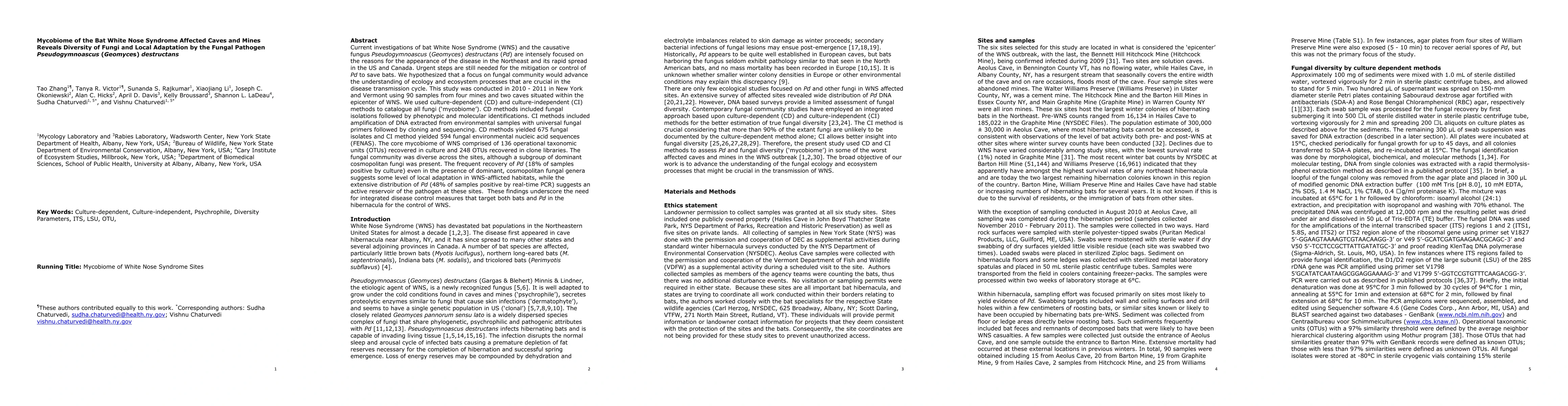 The investigations of the bat White Nose Syndrome (WNS) have yet to provide answers as to how the causative fungus Pseudogymnoascus (Geomyces) destructans (Pd) first appeared in the Northeast and how a single clone has spread rapidly in the US and Canada. We aimed to catalogue Pd and all other fungi (mycobiome) by the culture-dependent (CD) and culture-independent (CI) methods in four Mines and two Caves from the epicenter of WNS zoonotic. Six hundred sixty-five fungal isolates were obtained by CD method including the live recovery of Pd. Seven hundred three nucleotide sequences that met the definition of operational taxonomic units (OTUs) were recovered by CI methods. Most OTUs belonged to unidentified clones deposited in the databases as environmental nucleic acid sequences (ENAS). The core mycobiome of WNS affected sites comprised of 46 species of fungi from 31 genera recovered in culture, and 17 fungal genera and 31 ENAS identified from clone libraries. Fungi such as Arthroderma spp., Geomyces spp., Kernia spp., Mortierella spp., Penicillium spp., and Verticillium spp. were predominant in culture while Ganoderma spp., Geomyces spp., Mortierella spp., Penicillium spp. and Trichosporon spp. were abundant is clone libraries. Alpha diversity analyses from CI data revealed that fungal community structure was highly diverse. However, the true species diversity remains undetermined due to under sampling. The frequent recovery of Pd indicated that the pathogen has adapted to WNS-afflicted habitats. Further, this study supports the hypothesis that Pd is an introduced species. These findings underscore the need for integrated WNS control measures that target both bats and the fungal pathogen.