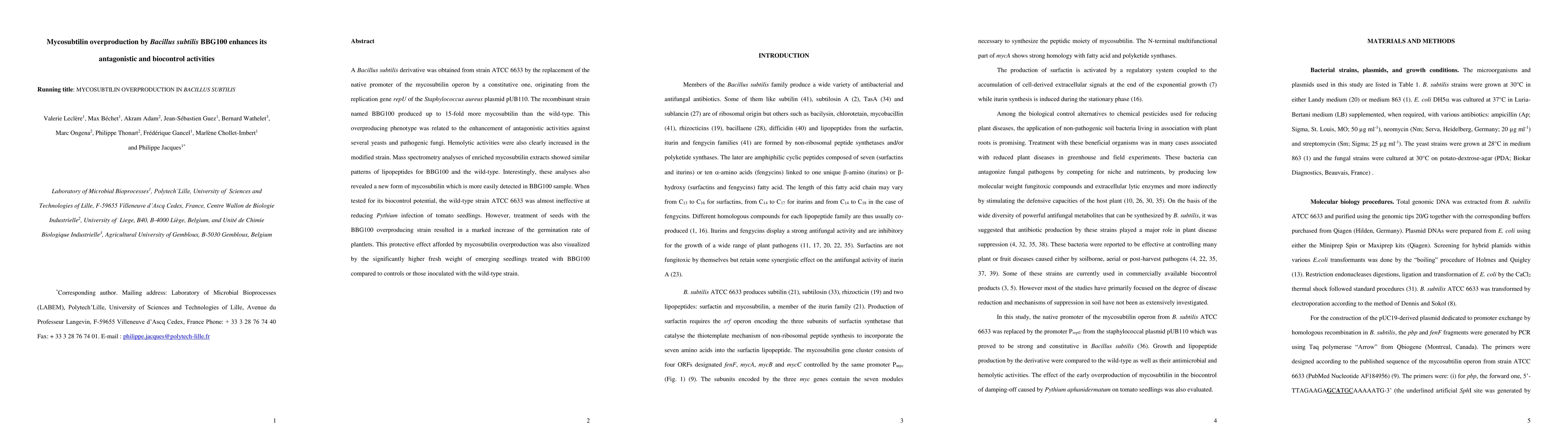 Bacillus subtilis BBG100 overproduces mycosubtilin, increasing its antagonistic and biocontrol activities, leading to improved protection of tomato seedlings against infection and enhanced germination rates.
