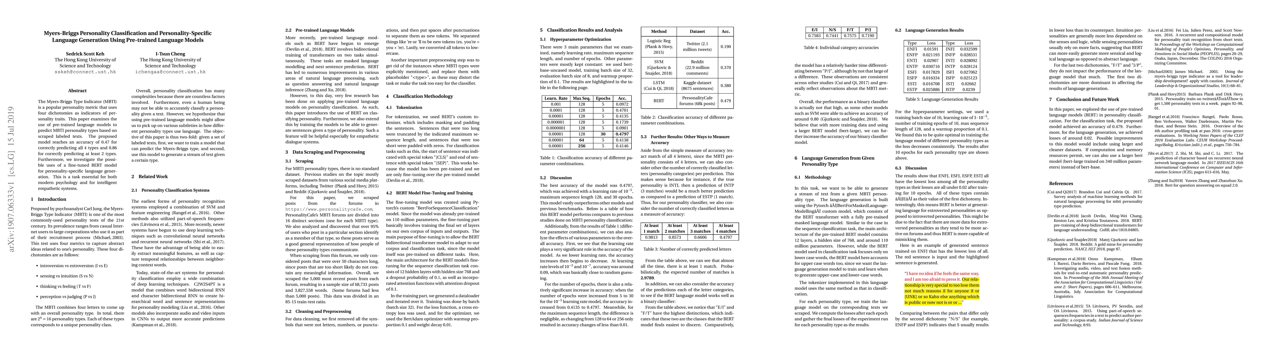 This paper explores using pre-trained language models to predict Myers-Briggs personality types from labeled texts, achieving an accuracy of $0.47$ for all types and $0.86$ for at least two types. It also investigates fine-tuned BERT for generating personality-specific language, crucial for psychology and empathetic systems.