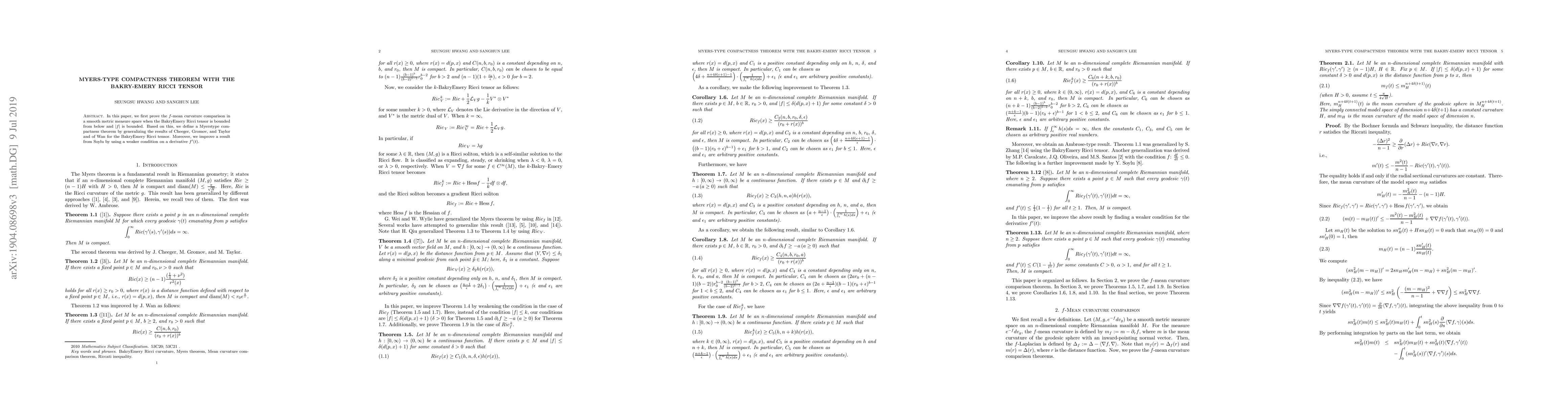 In this paper, we first prove the $f$-mean curvature comparison in a smooth metric measure space when the Bakry-Emery Ricci tensor is bounded from below and $|f|$ is bounded. Based on this, we define a Myers-type compactness theorem by generalizing the results of Cheeger, Gromov, and Taylor and of Wan for the Bakry-Emery Ricci tensor. Moreover, we improve a result from Soylu by using a weaker condition on a derivative $f'(t)$.