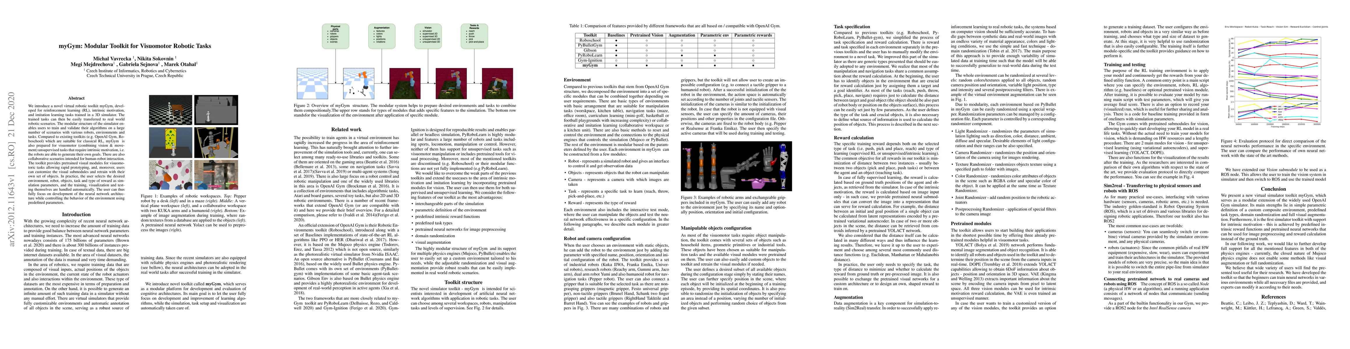 myGym is a modular toolkit for training robots in visuomotor tasks using reinforcement, intrinsic motivation, and imitation learning in a 3D simulator, with easy transfer to real-world applications. It offers customizable visual modules and supports human-robot interaction scenarios.