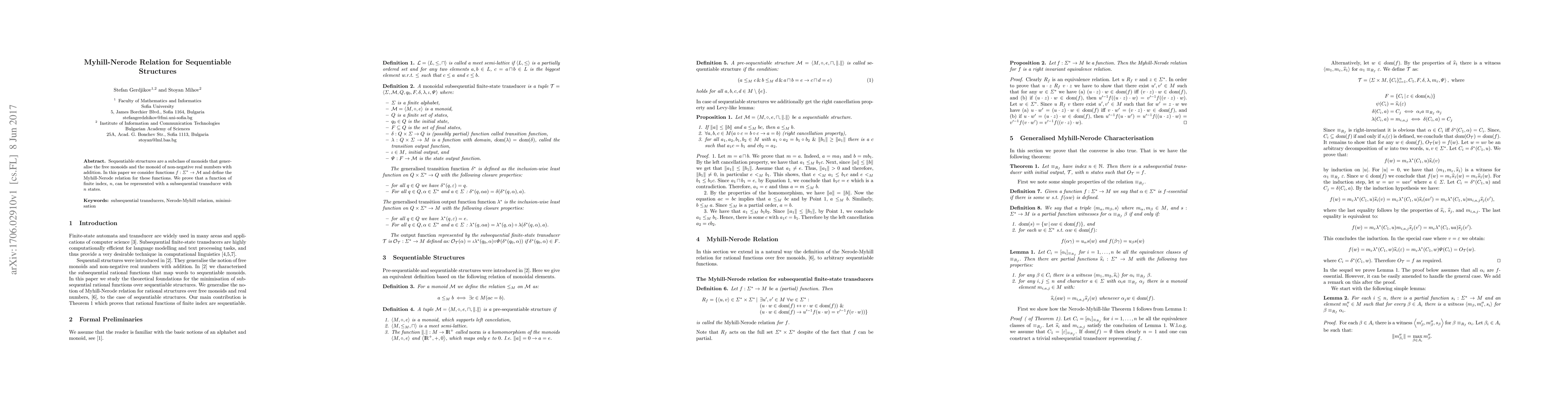 Sequentiable structures are a subclass of monoids that generalise the free monoids and the monoid of non-negative real numbers with addition. In this paper we consider functions $f:\Sigma^*\rightarrow {\cal M}$ and define the Myhill-Nerode relation for these functions. We prove that a function of finite index, $n$, can be represented with a subsequential transducer with $n$ states.