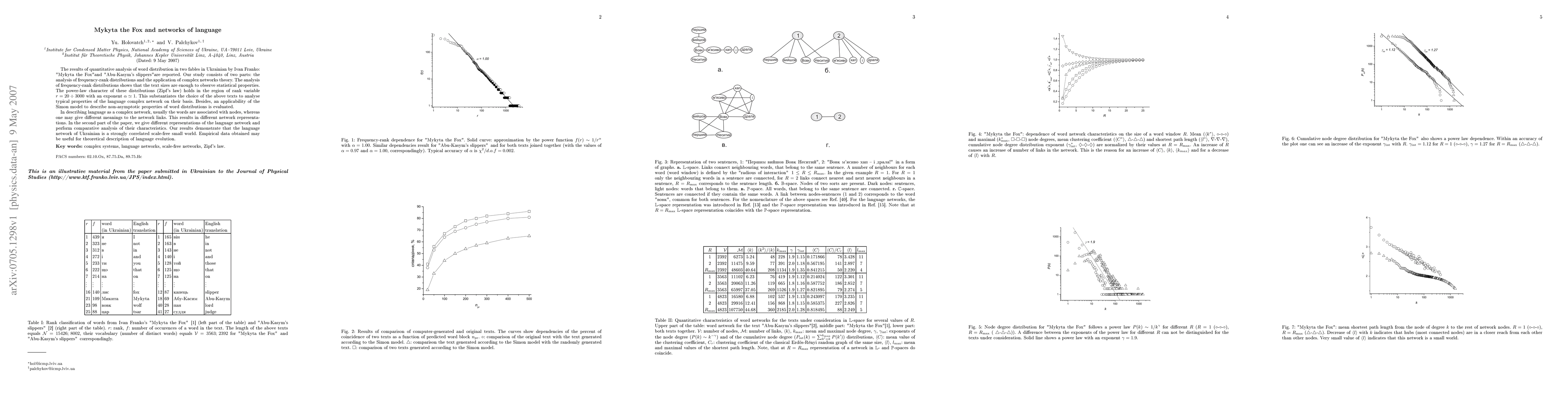The results of quantitative analysis of word distribution in two fables in Ukrainian by Ivan Franko: "Mykyta the Fox" and "Abu-Kasym's slippers" are reported. Our study consists of two parts: the analysis of frequency-rank distributions and the application of complex networks theory. The analysis of frequency-rank distributions shows that the text sizes are enough to observe statistical properties. The power-law character of these distributions (Zipf's law) holds in the region of rank variable r=20 - 3000 with an exponent $\alpha\simeq 1$. This substantiates the choice of the above texts to analyse typical properties of the language complex network on their basis. Besides, an applicability of the Simon model to describe non-asymptotic properties of word distributions is evaluated. In describing language as a complex network, usually the words are associated with nodes, whereas one may give different meanings to the network links. This results in different network representations. In the second part of the paper, we give different representations of the language network and perform comparative analysis of their characteristics. Our results demonstrate that the language network of Ukrainian is a strongly correlated scale-free small world. Empirical data obtained may be useful for theoretical description of language evolution.