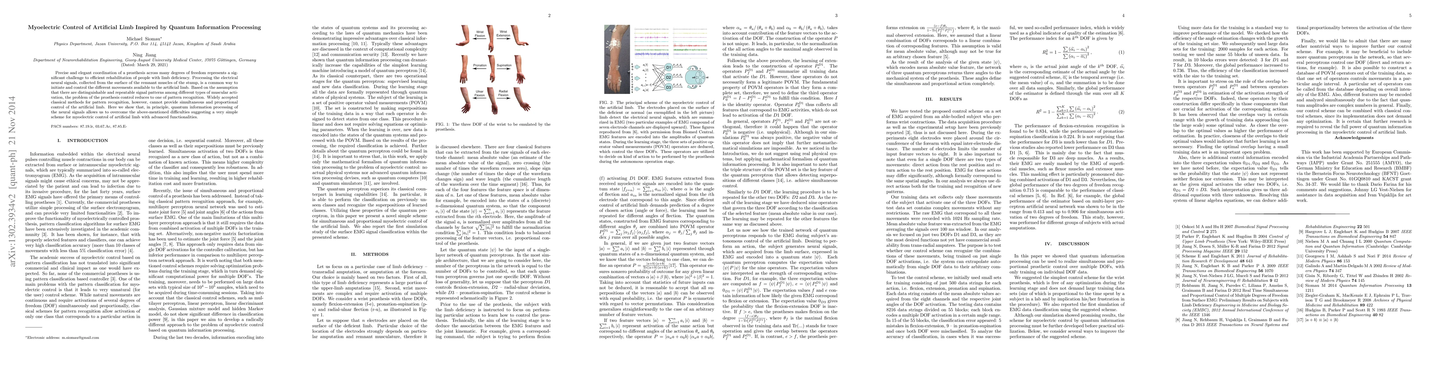 This paper proposes a quantum information processing approach to enhance myoelectric control of artificial limbs, aiming to achieve precise and proportional movement coordination. Traditional pattern recognition methods fall short in simultaneous control, but quantum processing offers a potential solution for advanced functionalities.