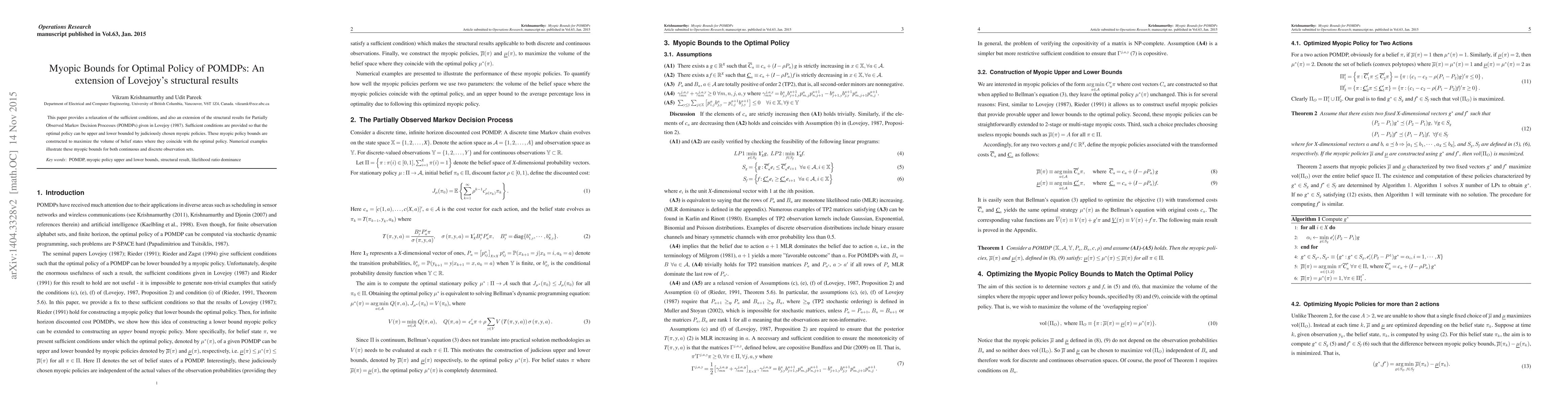 This paper extends Lovejoy's structural results for POMDPs by providing sufficient conditions for upper and lower bounding the optimal policy with myopic policies, maximizing the volume of belief states where these bounds coincide. Numerical examples demonstrate the effectiveness of these myopic bounds for both continuous and discrete observation sets.